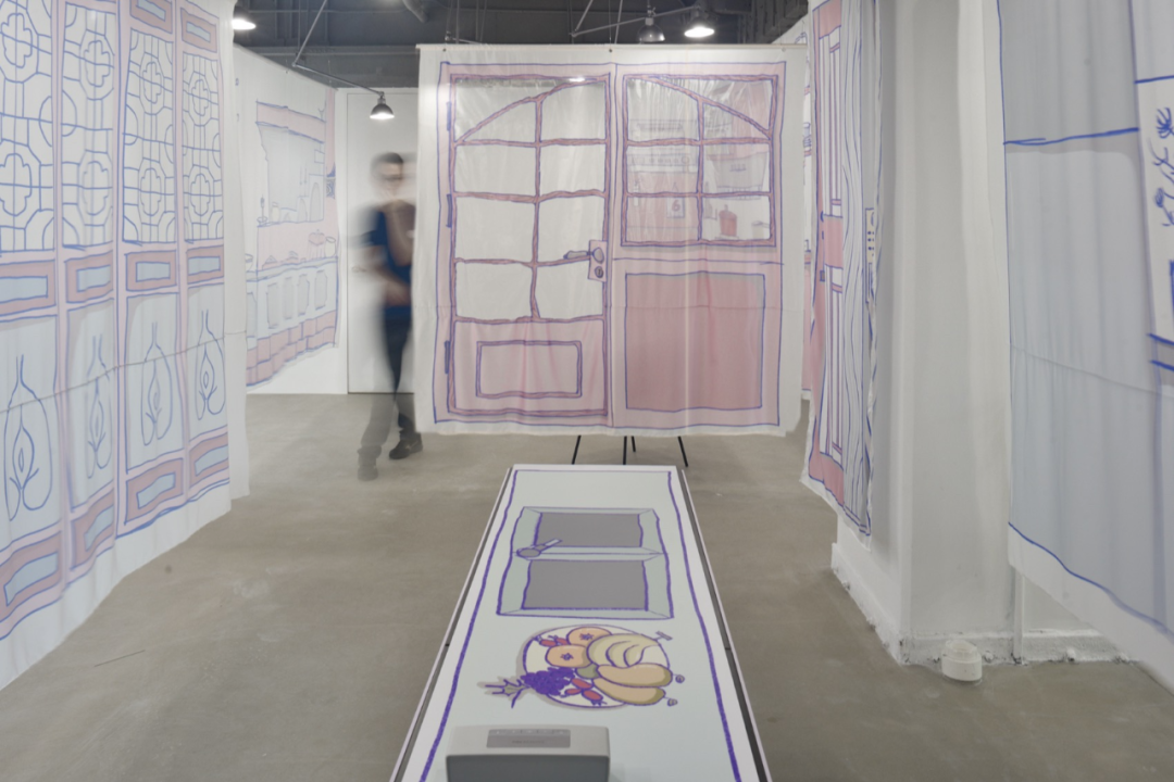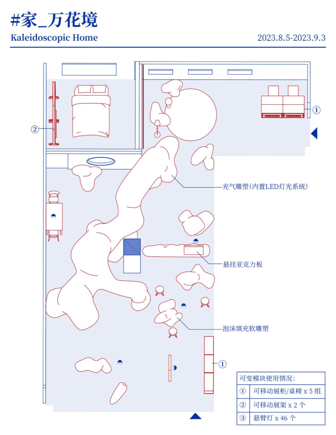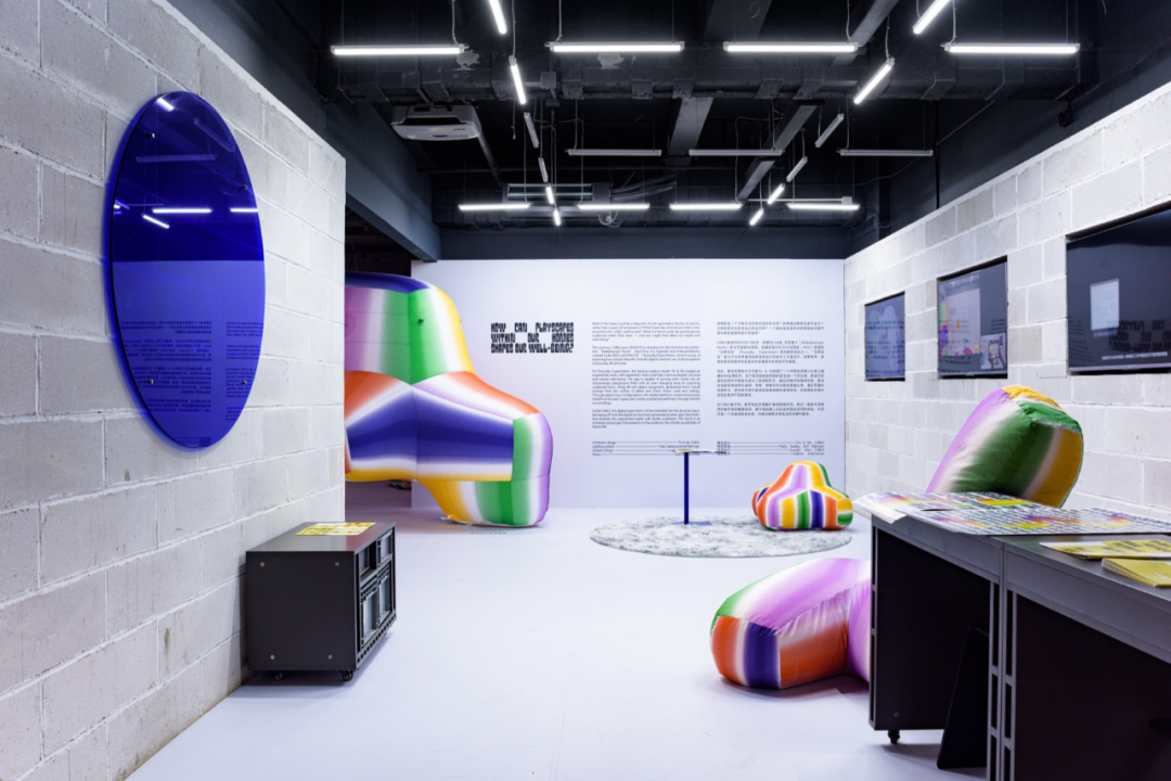 The core of this exhibition is a set of soft sculptures, which, due to their large size and unique lighting system, require maximum space preservation to highlight the content of the exhibits. The exhibition hall adopts a relatively neutral and restrained material language, which can easily achieve low-cost scene switching. The scattered arrangement of home furnishings and cantilever lighting system further creates an exhibition atmosphere. At the same time, the toolbox showcasing hard industrial properties contrasts sharply with soft sculptures, becoming an exhibition element and visual focus.
