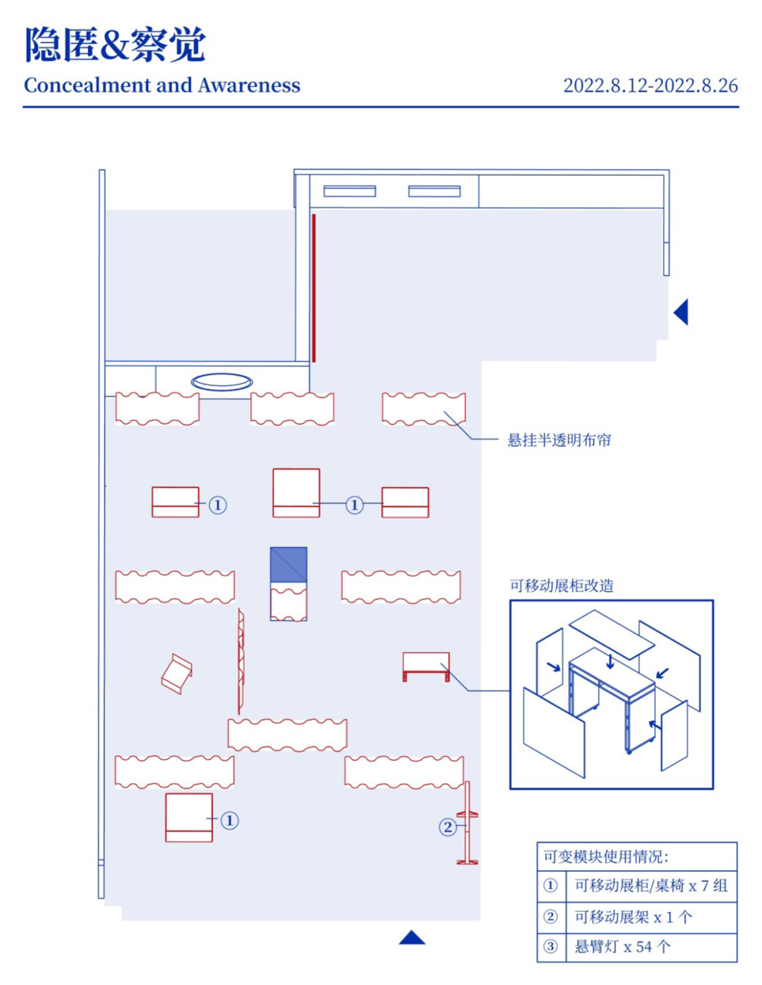 The exhibition mainly uses flexible semi transparent materials for spatial separation, transforming movable display cabinets and tables and chairs into interactive installations. Through minimal spatial transformation and maximum utilization of variable modules, an immersive exhibition experience has been achieved.