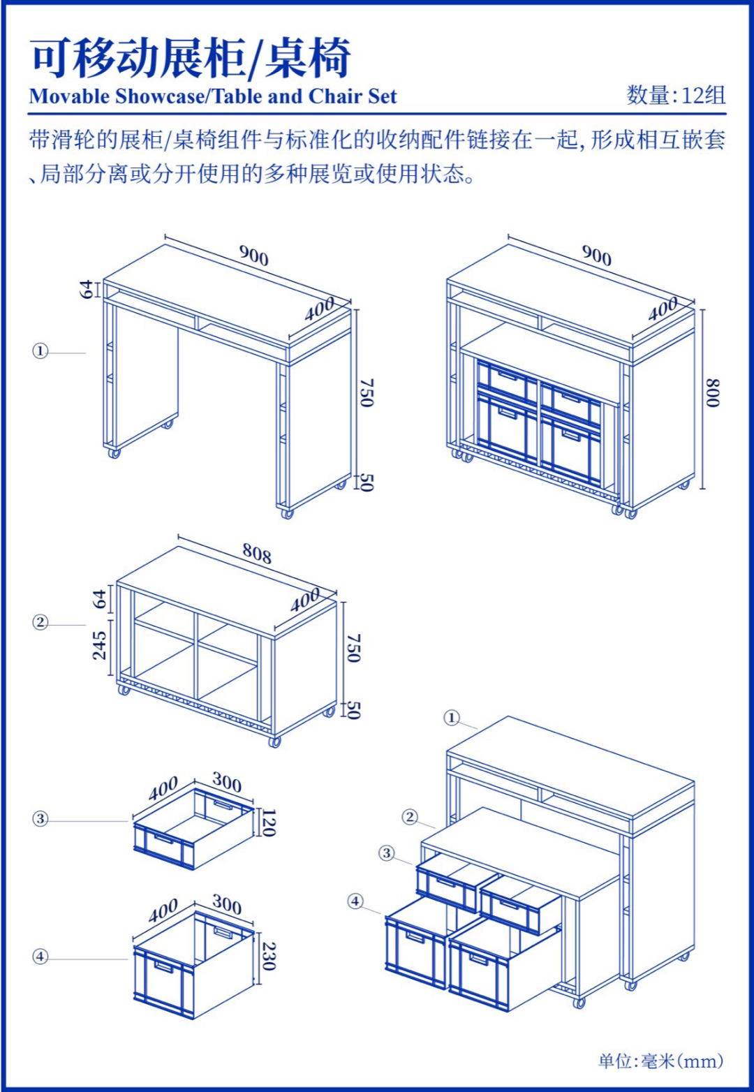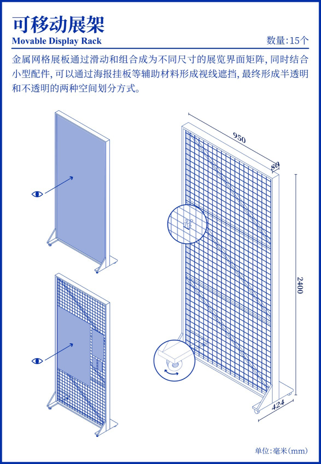 This exhibition is a high-density display of campus works and content, which is also very challenging for limited space and venue, and also a test of extremely short exhibition time. By extending continuous exhibition stands into exhibition walls, movable tables and chairs can be formed into long exhibition tables, which can elongate the viewing flow and increase the display area, resulting in high-density presentation of works.