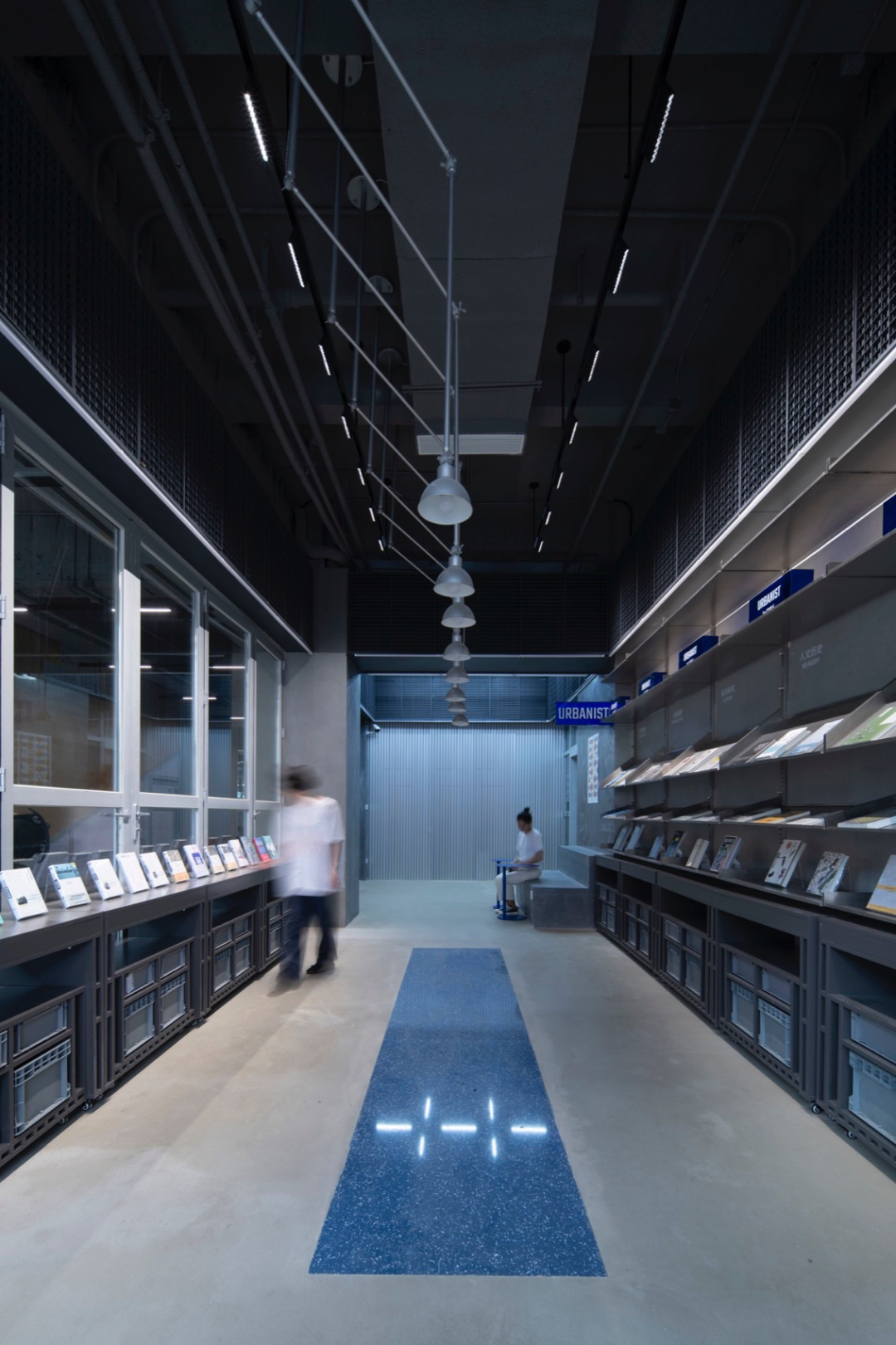 CABLE场地包括一楼书店和二楼展厅,它们在流线上相对割裂。为了使这两个区域产生感知上的联系,设计采用了统一的材质和模块系统,以相同的构成和组织方式来统一二者的氛围,形成一个完整的体验载体和情绪容器。整体空间在气质上延续了场地作为轻工业生产场所的历史,主要采用了相对中性和克制的材料语言。主要界面沿用了老厂房原有的灰色调,使用了加气砖、水泥自流平和不锈钢等主材,与空间模块配合进一步强化了软硬装一体化的设计策略。这样的设计手法不仅在视觉上统一了空间,还在情感上营造了一种延续历史的氛围,使人们能够更加自然地融入到空间中。