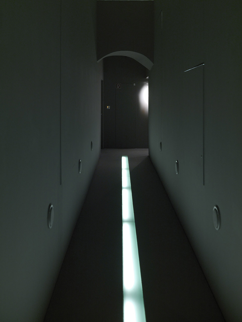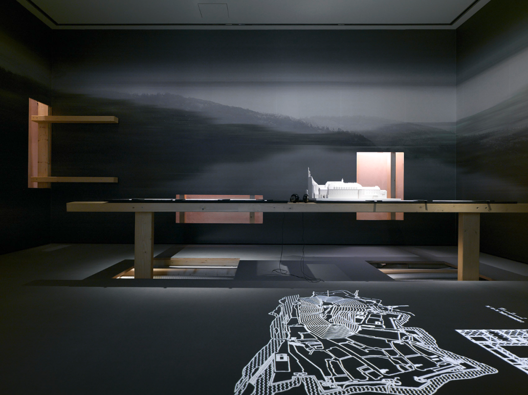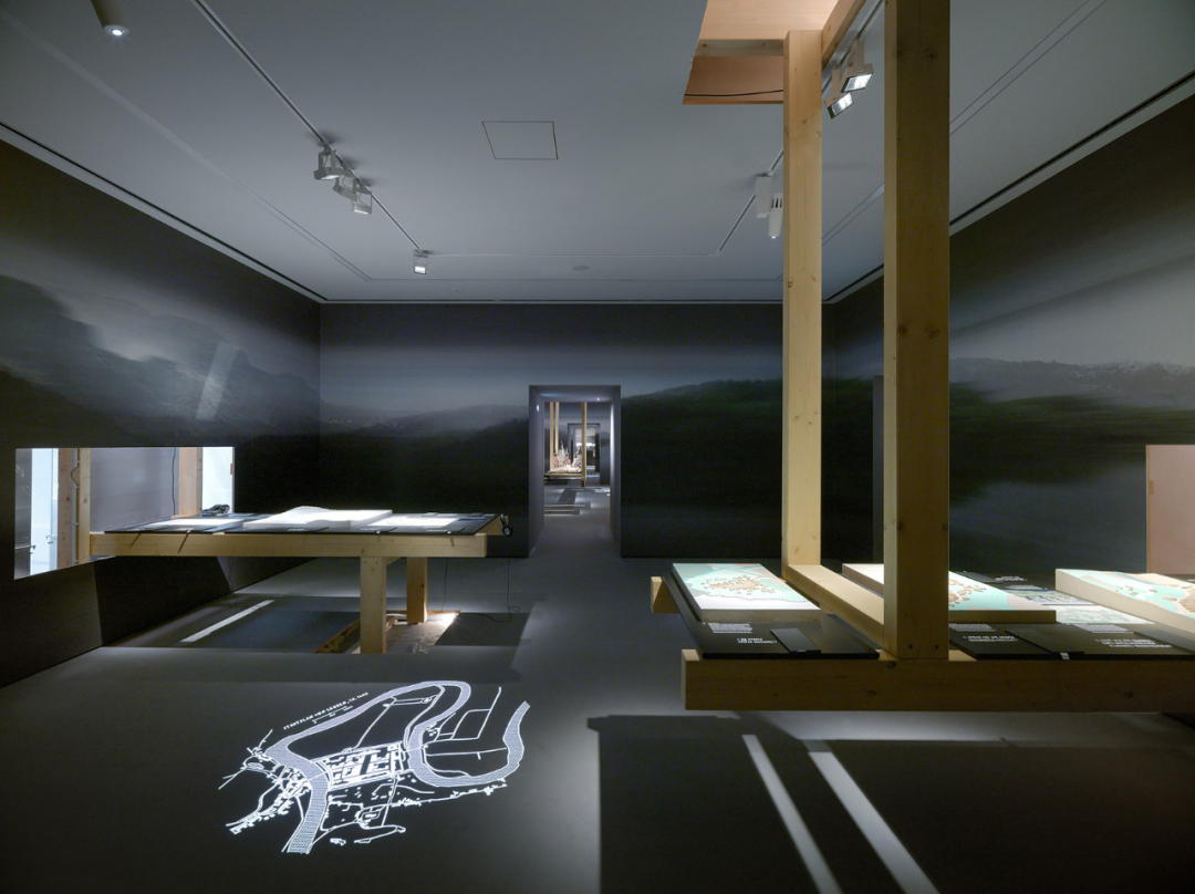地面上投射着不同城市的结构和建筑类型,以及由公路和小径构成的网络,成为沉浸式体验的一部分。尺寸较大的展品如罗马时期的墓碑、颈手枷、精致的管风琴碎片和军用帐篷,作为历史的碎片和见证者出现在游览路径的两侧。