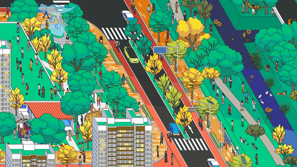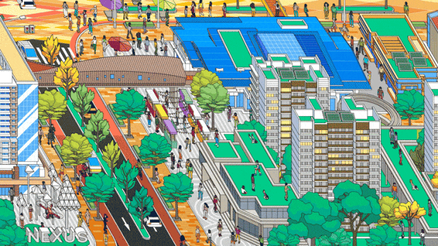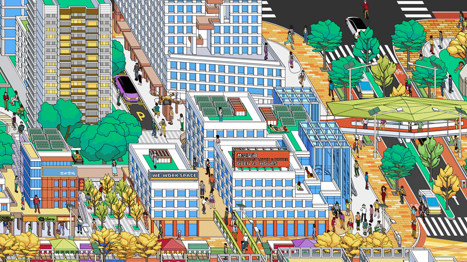 依托于极其细腻的规划、超高浓度的场景、对未来的适度想象,观众可以在这幅插画中更直观地感受到理想之地的肌理与温度。改写下卡尔维诺对城市的描述:“理想之地”是一本巨大的参考书,是一本查阅社区未来的百科,包罗万象,却触手可及……”
