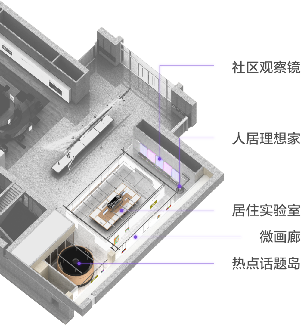 “未来工坊”则是一处更多元、更有活力的策展能量场。它创造性地由居住实验室、社区观察镜、人居理想家、热点话题岛、微画廊几个模块组成,如同手机中一个个独立的APP。它们共同聚焦“未来社区和城市”这个母题,并分别从不同视角出发、与不同资源共建,并进行不定期更新,邀请公众一起,去持久探讨未来的无限可能。