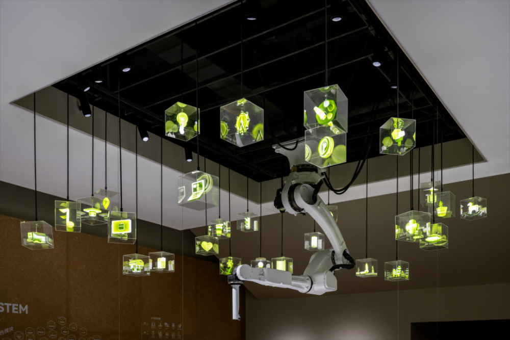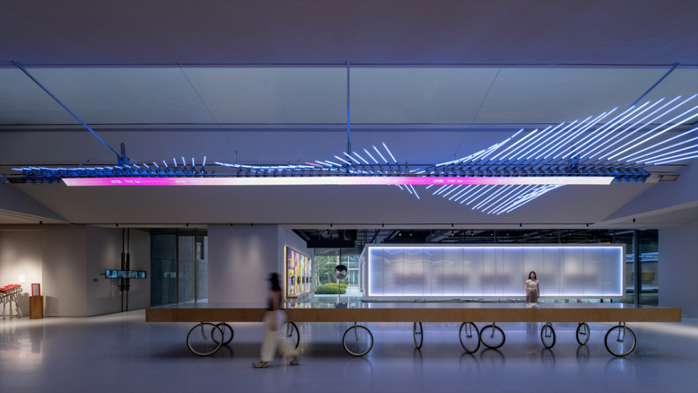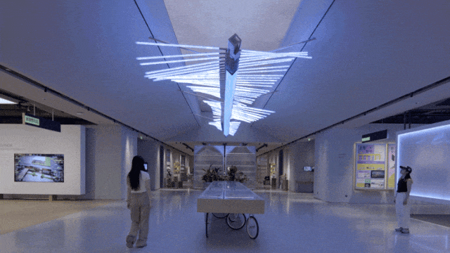Therefore, we have created a large-scale suspended dynamic art installation here - synchronic symbiosis, to reflect a more sustainable future value, and to become the first visual impression of the new exhibition hall without occupying much physical space. At the same time, in the lower channel space, we have designed a flexible "wheel booth" through the modification of Shanghai permanent bicycles, which can serve for hosting small temporary exhibitions.
