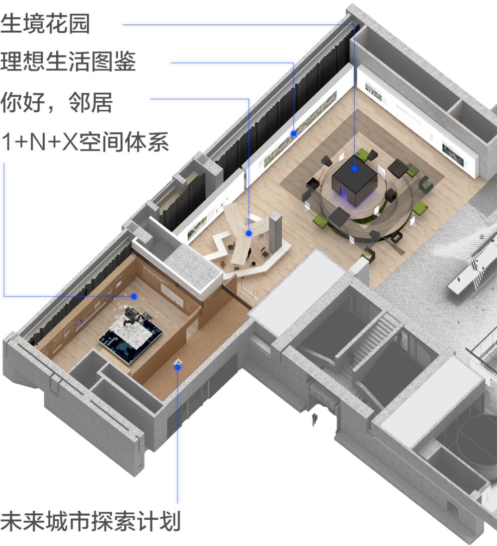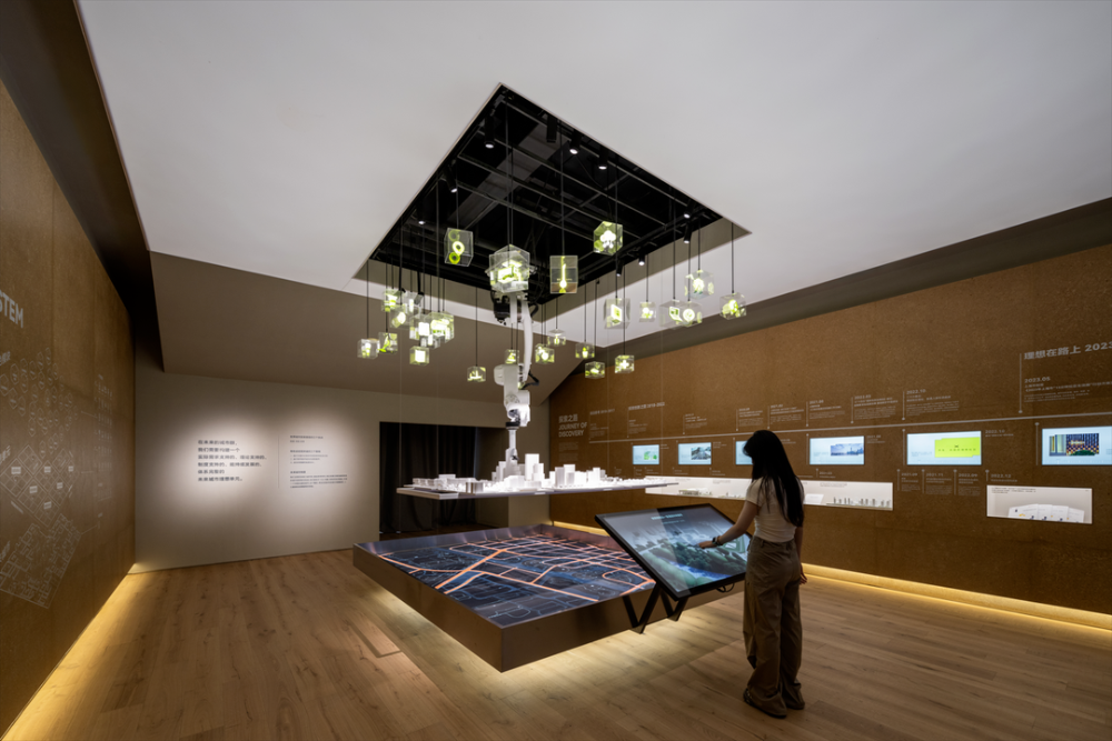 Passing through the theater, the next space will focus on introducing the core research results of the exploration plan. Through in-depth interpretation of the results, we will focus on the "1+N+X" spatial system and use rich media interaction methods to build a three-dimensional, intuitive, and vivid model scene.