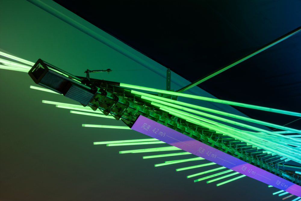 艺术装置以社区与自然的共时共生为设计概念,选取理想之地社区中“风”(自然风速)、“光”(采光照度)、“水”(雨水存量)、“电”(光伏系统发电功率)四组实时数据联动,以更艺术化的方式,呈现理想之地对低碳未来的实践与思考。