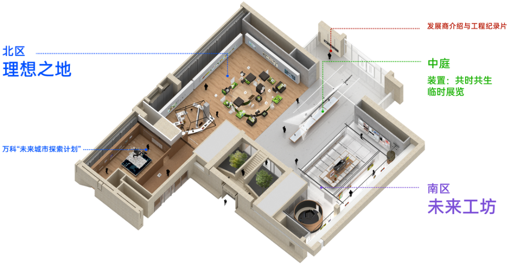 新新所展厅区域整体包含北侧“新理想社区”、南侧“未来工坊”两个主要展区及中庭多功能空间。