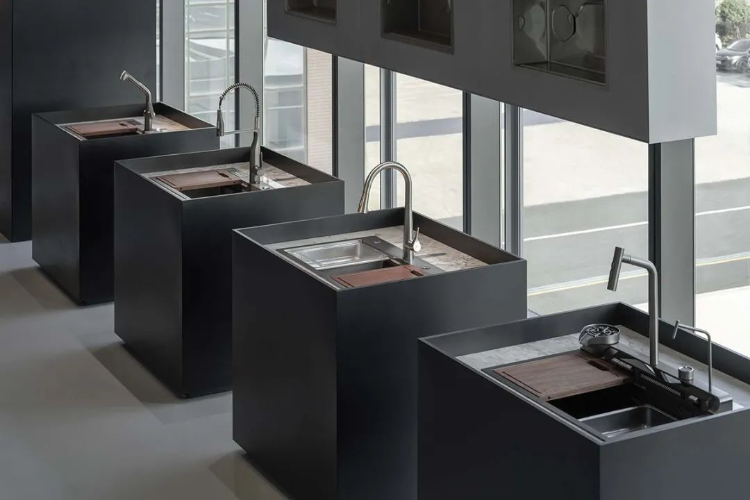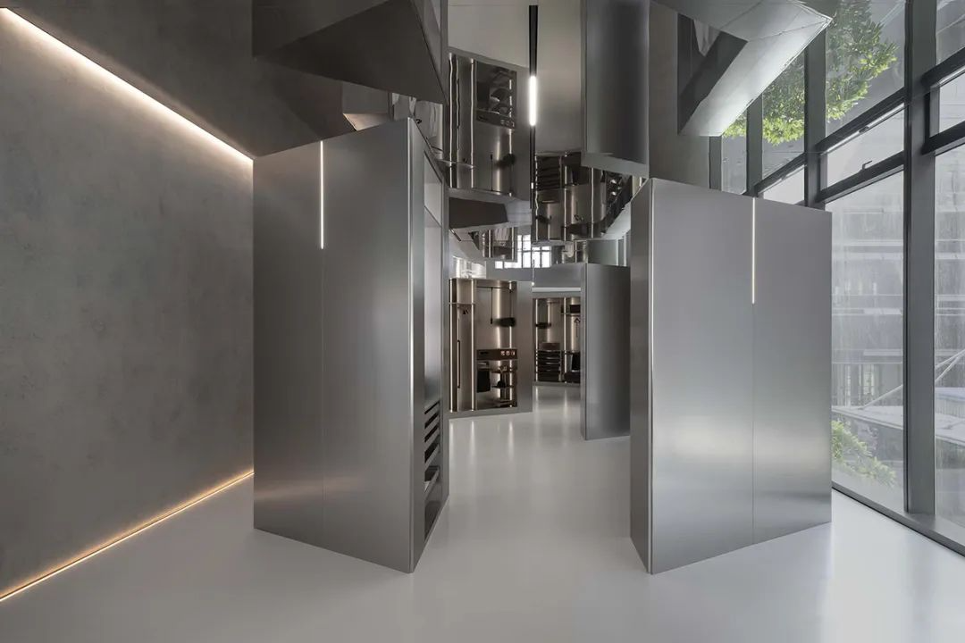 Cabinets and island platforms "replicate" the daily life, with a consistent principle of simple facade design, the calmness and restraint given by stainless steel material, and the solemnity brought by symmetrical slopes. The hardware accessories hidden within it, accompanying and evolving into exquisite collections.