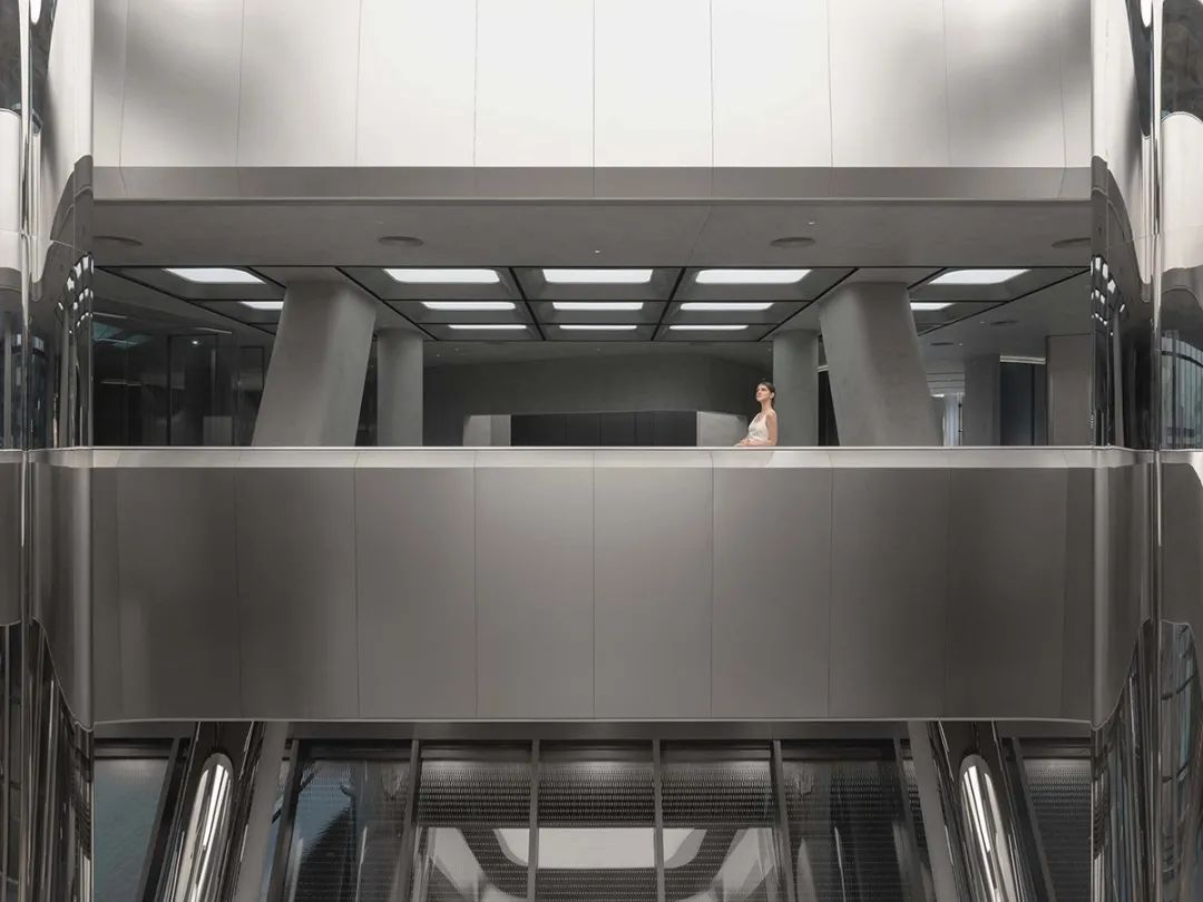 挑空的大堂,构筑空间秩序的传统形式被摒弃,改由延绵不绝的异形不锈钢巧妙串联。