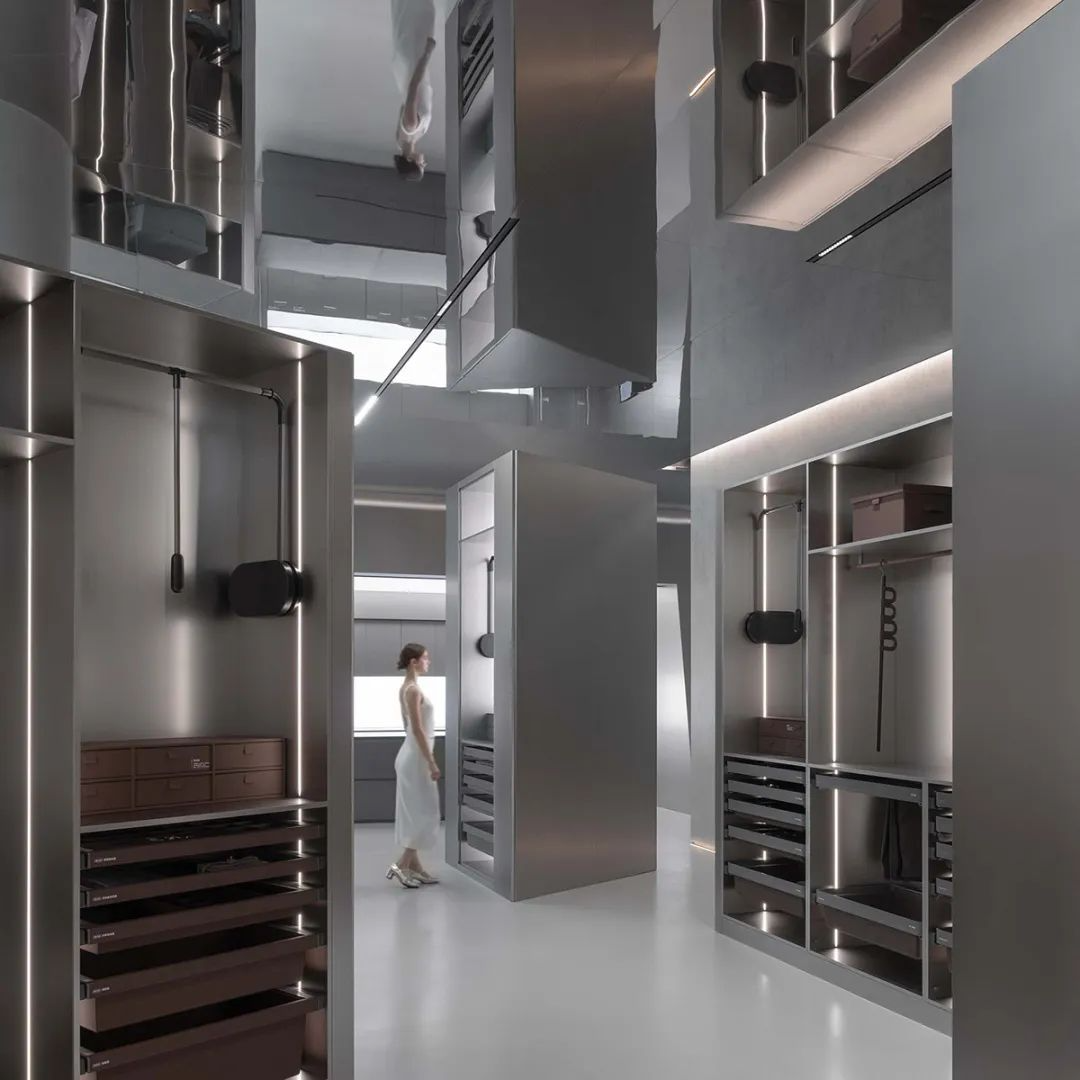 步行至衣柜五金展示区,入口的不锈钢三角形衣柜,以鲜明的设计喻示着日常秩序挑战的开始。接连交错的折叠造型制造无限遐想,彰显陈列的精细与用心。若隐若现的视线遮掩,则能巧妙消解一览无余的单调乏味。