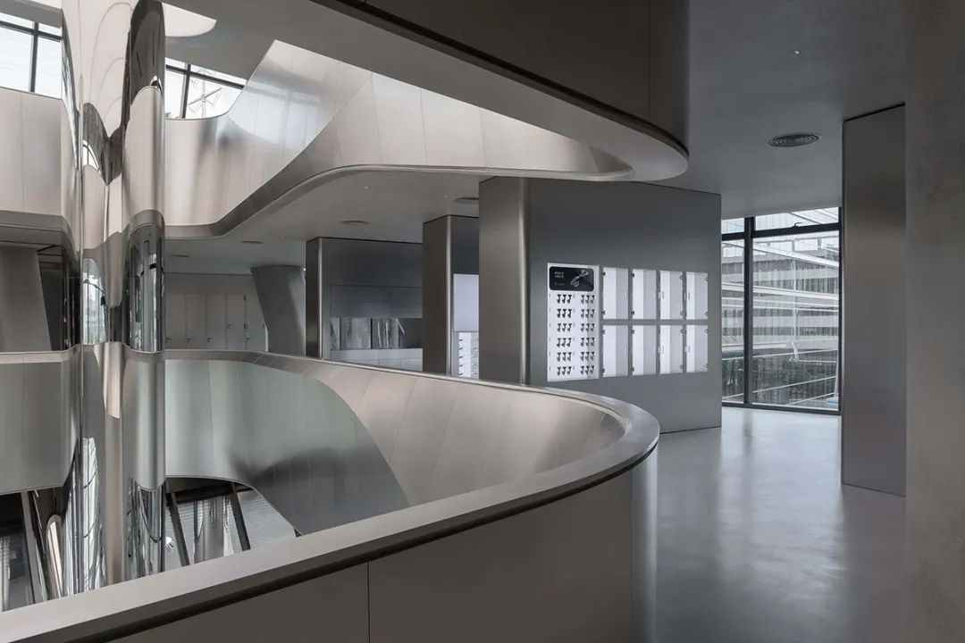 The traditional form of constructing spatial order in the empty lobby has been abandoned, and instead, it is cleverly connected by continuous irregular stainless steel.