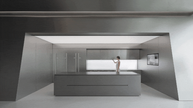 橱柜和岛台“复刻”生活的日常,而贯穿始终的简洁立面设计原则,不锈钢材质赋予的冷静与克制,对称斜面带来的庄严感。隐于其中的五金配件,随行而示,演化成为馆藏精品。