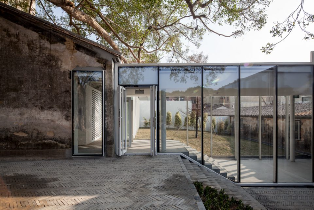 After demolishing the middle partition wall of two old buildings, the remaining peripheral walls were structurally reinforced and coated with protective agents to preserve the mottled texture of the walls. The old concrete beams on the roof have been removed, and a steel frame has been used to rebuild the roof structure. Recycled old tiles have been added, allowing for a rearrangement and combination of new and old vocabulary. The original building has been endowed with new language, space, function, and vitality, achieving a symbiotic unity between the old and new buildings and the environment. The door and window openings of the old building are still preserved to reduce damage to the original walls. The newly built doors and windows adopt an undivided high transparency ultra white frame, and the lightweight and modern glass metal material forms an interesting dialogue between the new and the old, history and modernity with the mottled marks on the wall.
