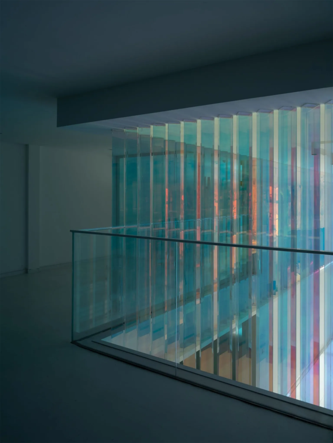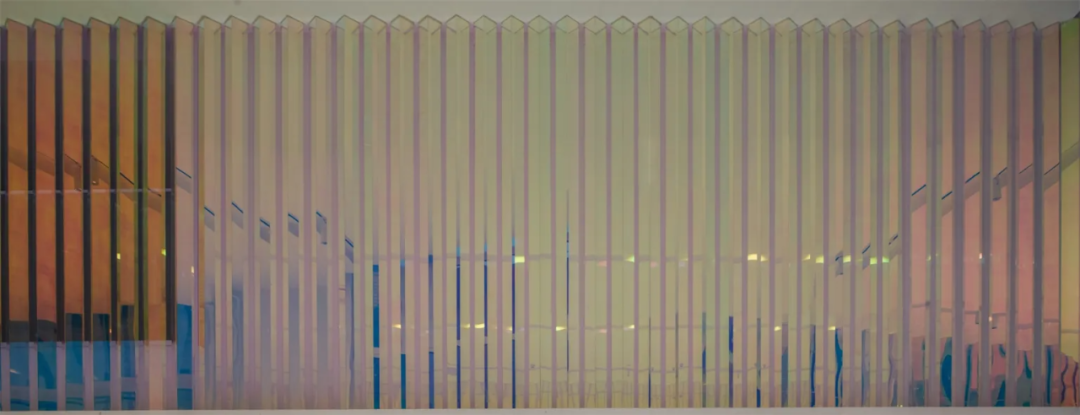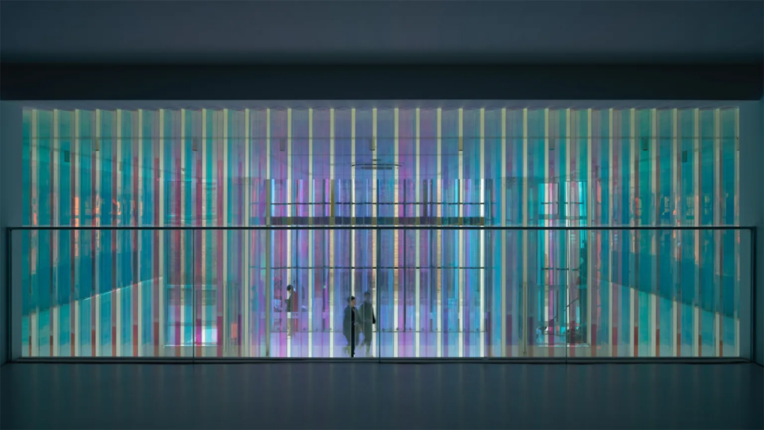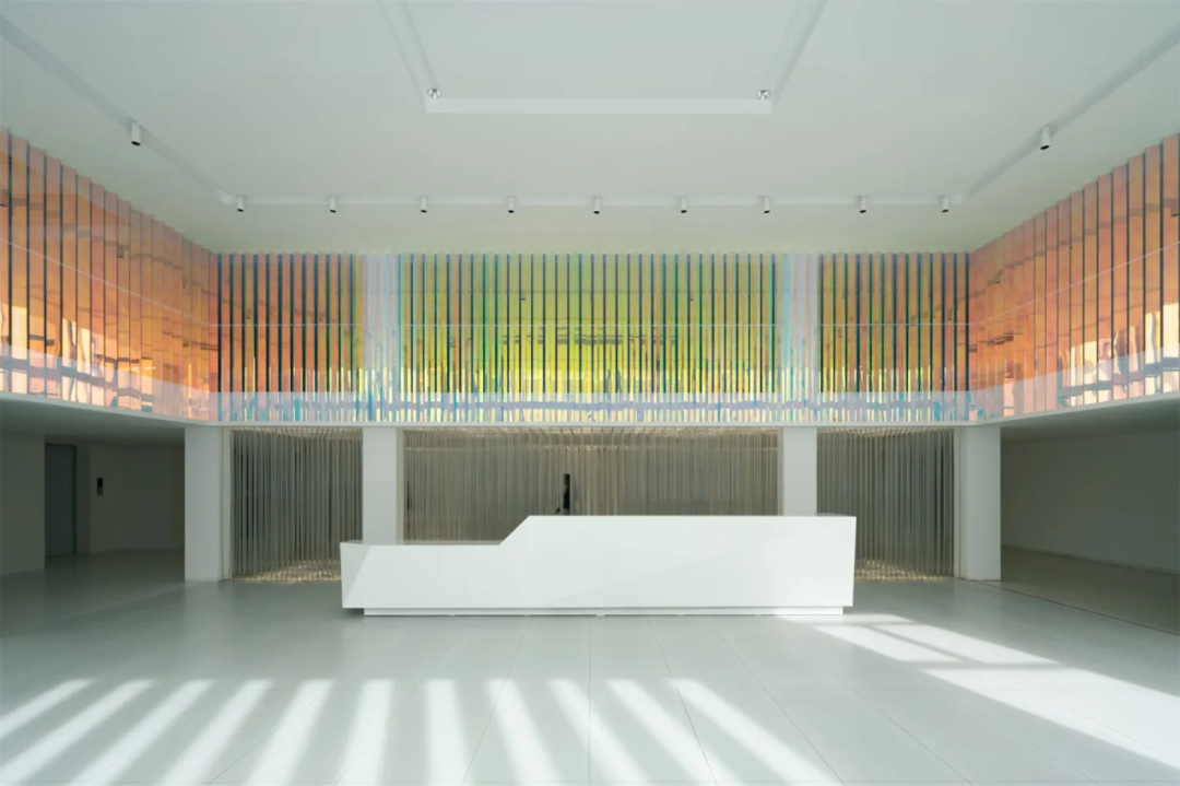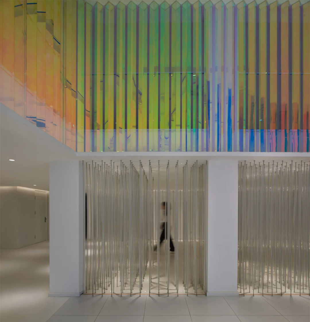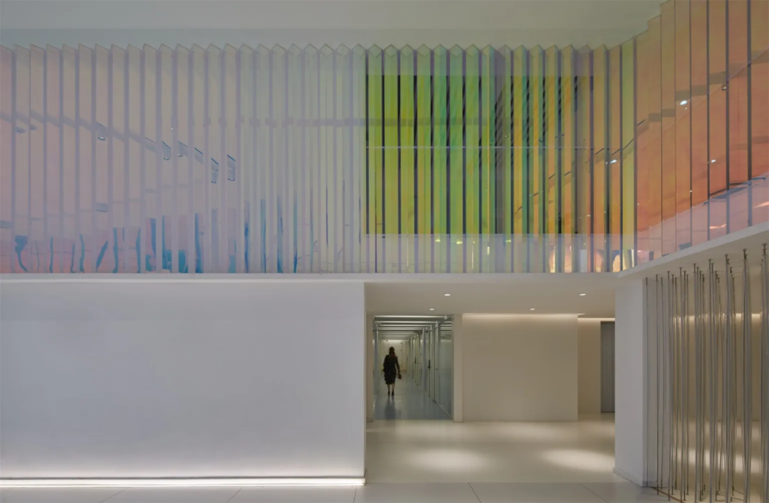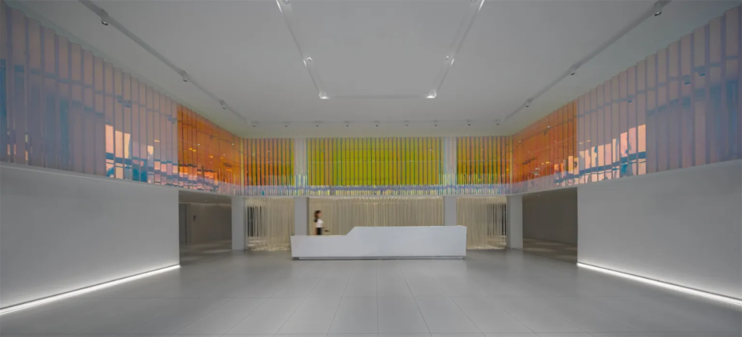 进入大厅,与白色外立面截然不同的大面积色筒装置,令人耳目一新。它以线成面,由面成棱,重复阵列,构建出三面特殊的彩色墙体,明媚的“暖色调”散发着波光粼粼的温暖感,是视觉记忆的延续,也是对旧厂房时光的追忆。这种非直接的色彩表达形式,带来流动起伏之感,也在无形中与外立面的造型交相呼应。在造型、色彩、光影的交融下,室内外空间与园区、城市、甚至是思想上,都产生了微妙的联系。经由南侧楼梯向上,来到企业公共走廊区域,人们可以看到色筒装置的另一幅“面孔”,它以深邃静谧的“冷色调”示人,制造沉稳的办公氛围。