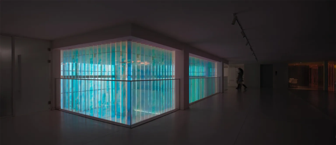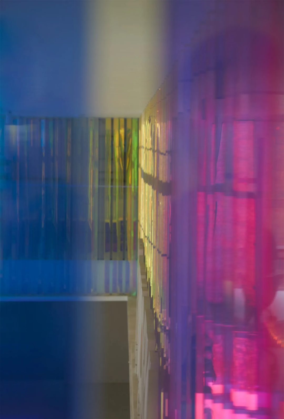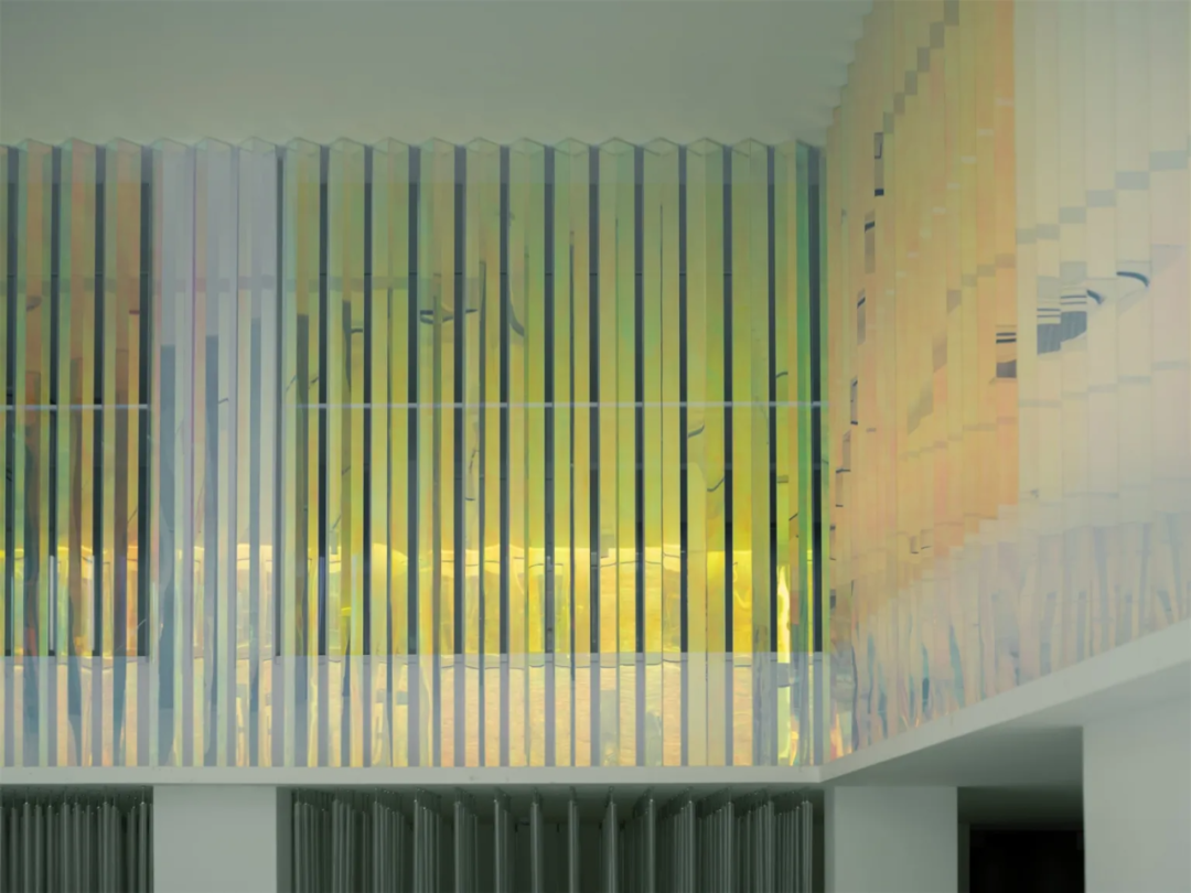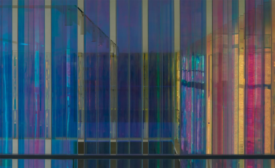 色筒装置的不同质感(色调、亮度、饱和度)变化,将空间自然的分区开来,这种奇妙的观感,来自设计团队的多次实验。设计过程中,团队首先选择了轻盈通透的亚克力材料,制作棱形色筒单体;接着将特殊的3M反光彩膜,贴附于其中两个面上;最后以45度角的排列方式放置色筒,从而实现移动间的色彩变幻。当从前厅看去,整个装置通体映现暖色调,给人以包容舒适的体验,而从内部向外看,则是沉静的冷色调,营造平静的氛围感。