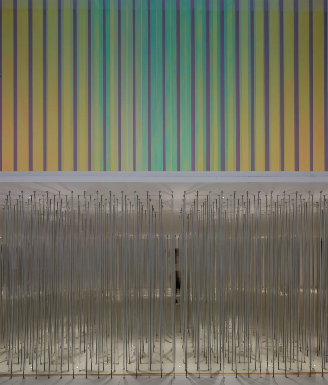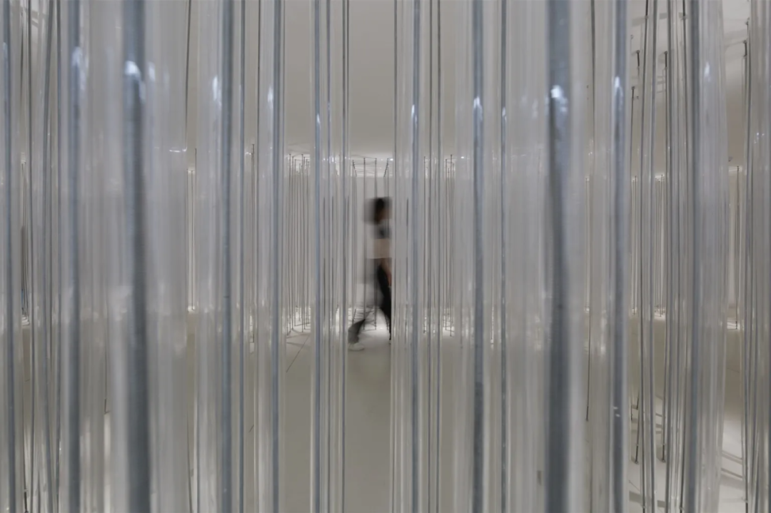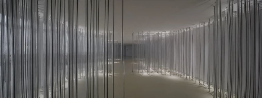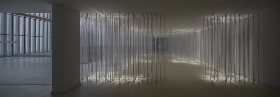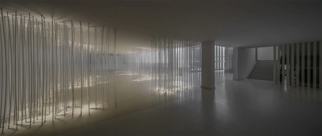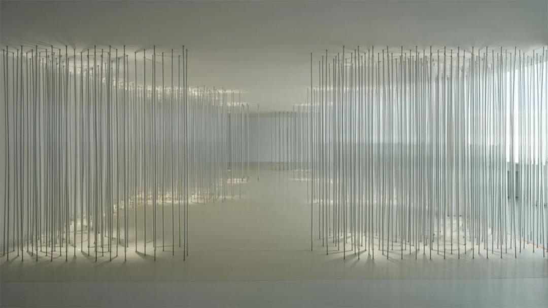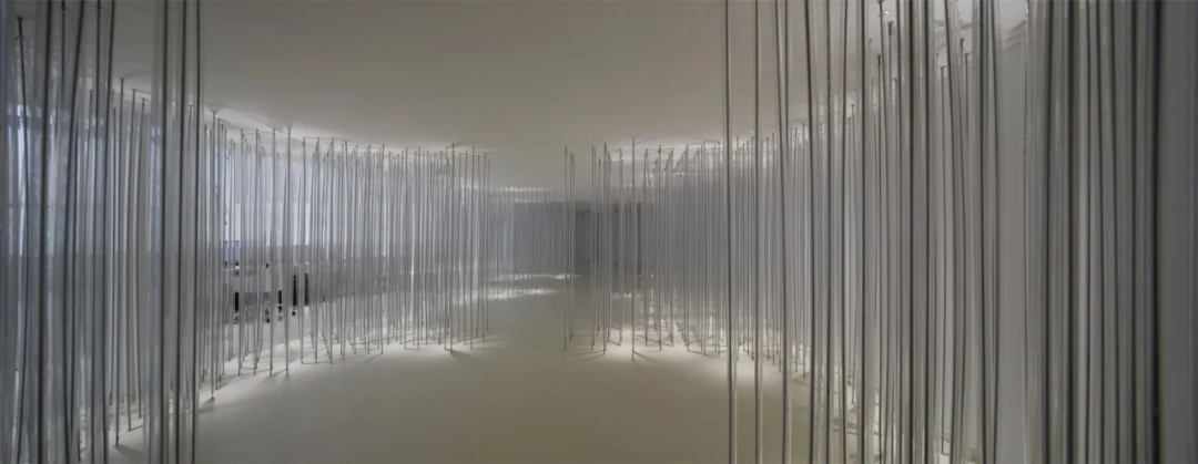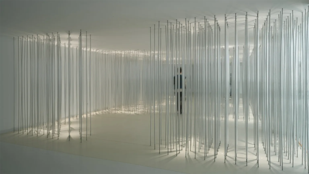 Below the installation, there is a rest area for visitors to interact and immerse themselves. Countless steel wires are wrapped by transparent 2cm acrylic cylinders. They connect the ceiling and the ground, while arranged in a dense and orderly manner. With the upper and lower lights, a natural and ethereal sense of light and shadow emerges, like a light carrier, supporting a brilliant dream.
