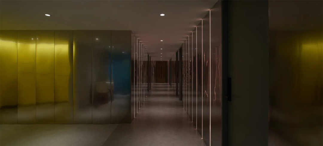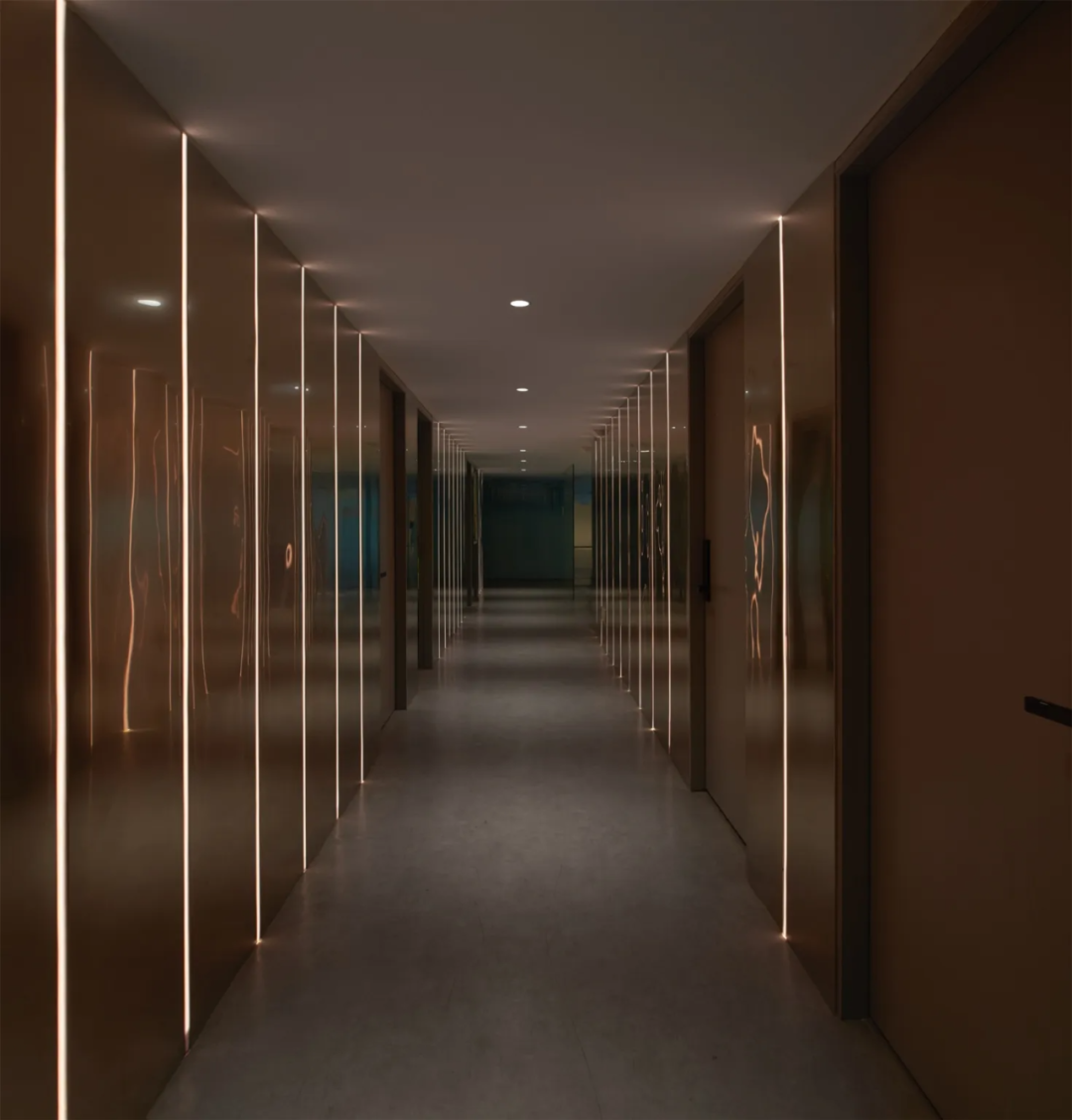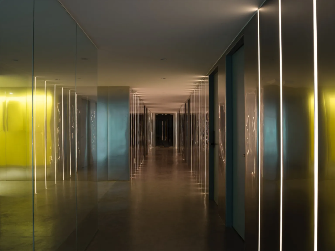 色筒装置的两侧空间,是影视公司进行后期调色的办公区域,暗色调的廊道环境,为技术人员提供了辅助。在不锈钢墙面与灯带的映衬下,整个廊道如同艺廊一般,反射“光影”,制造“回响”。这种简洁的设计手法,不仅回应了主题,更兼具功能性与观赏性。