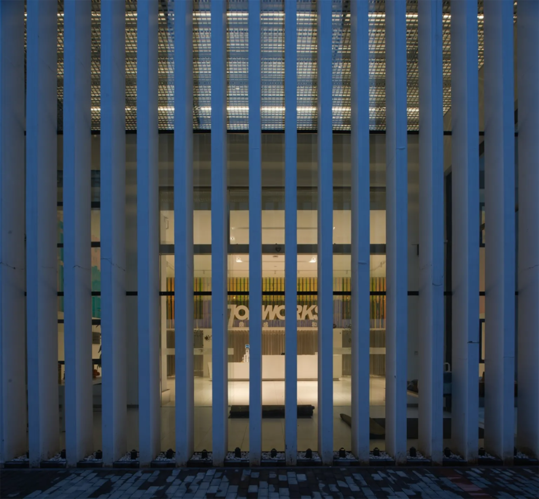 Stepping into the lobby, the large-area color tube installation, which is completely different from the white facade, looks very refreshing. From lines to faces, and prisms, it repeats the array to construct three special colored walls. The bright warm scene provides a sparkling warmth, which is a continuation of visual memory and a recall of the old factory days. This indirect form of color expression brings a sense of flow and undulation, and also invisibly echoes the shape of the facade. Under the fusion of shape, color, light, and shadow, the indoor and outdoor spaces have a connection with the creative park, the city, and even people‘s thoughts. Going up the stairs on the south side to the public corridor area of the company, people can see another ‘face’ of the color tube installation. It shows with a deep and cold scene, creating a calm office atmosphere.