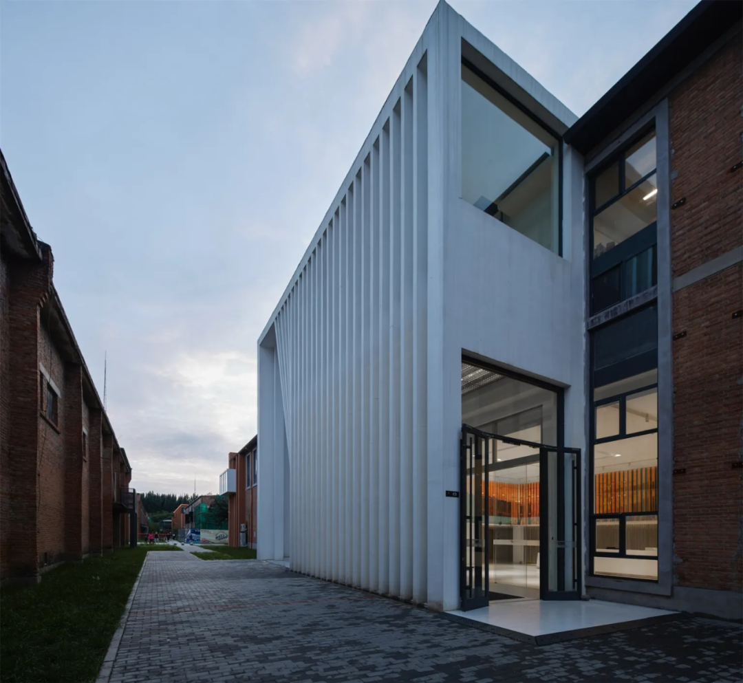 颇具年代感的工业厂房摇身一变,成为现代企业入驻的办公空间。在现代材料的融合下,旧厂房的红砖建筑被白色格栅包裹起来,唤起了人们对于工业形式和材料的全新认知。建筑立面上,设计团队将部分红砖墙拆除,取而代之的是大面积的玻璃,为室内引入更多自然光线,其外部紧密的格栅,构筑“光束”造型,增加隐私感。这一手法不仅回应了概念元素中的“光”,又将主入口巧妙移至东侧,形成体验上的迂回缓行之感。