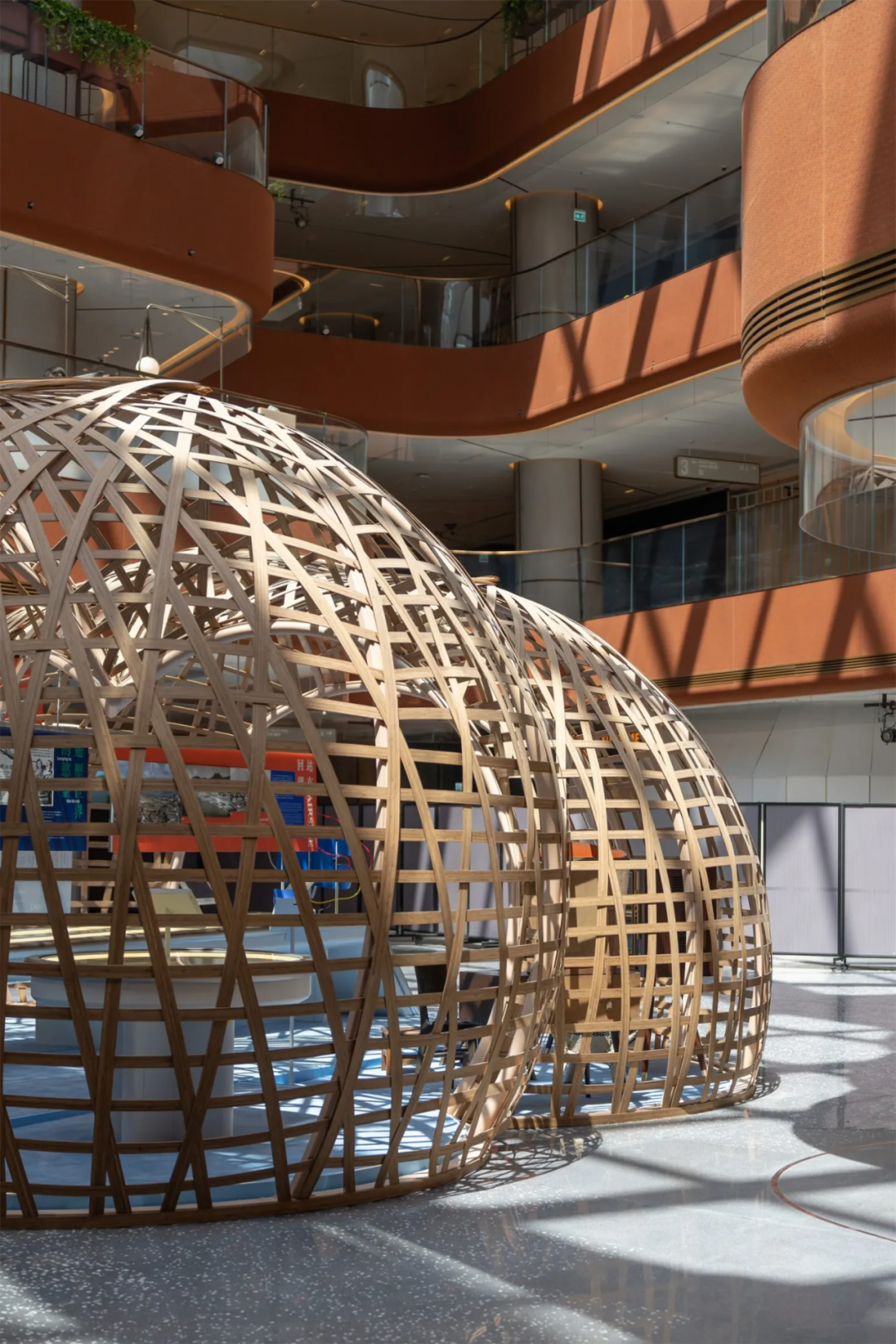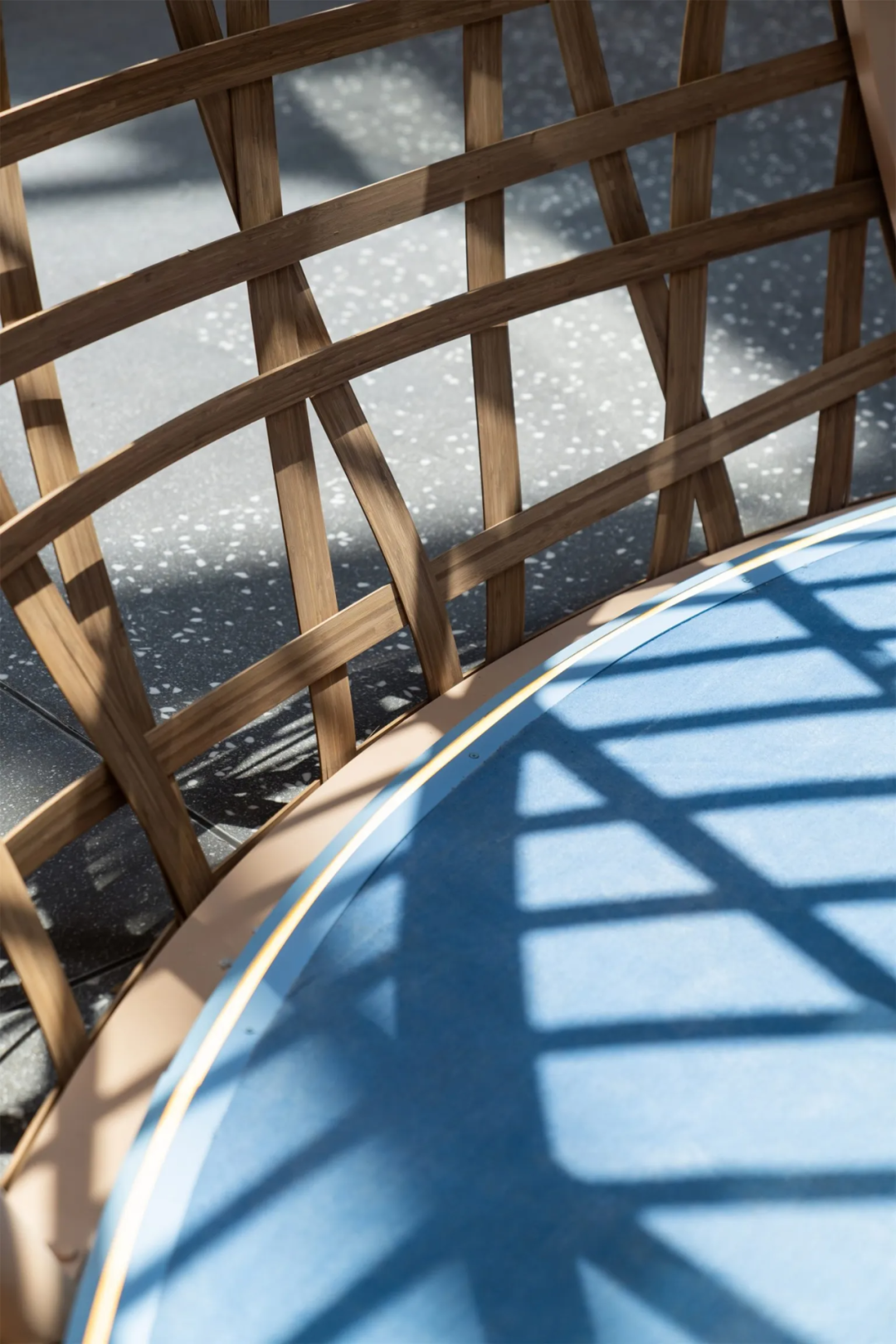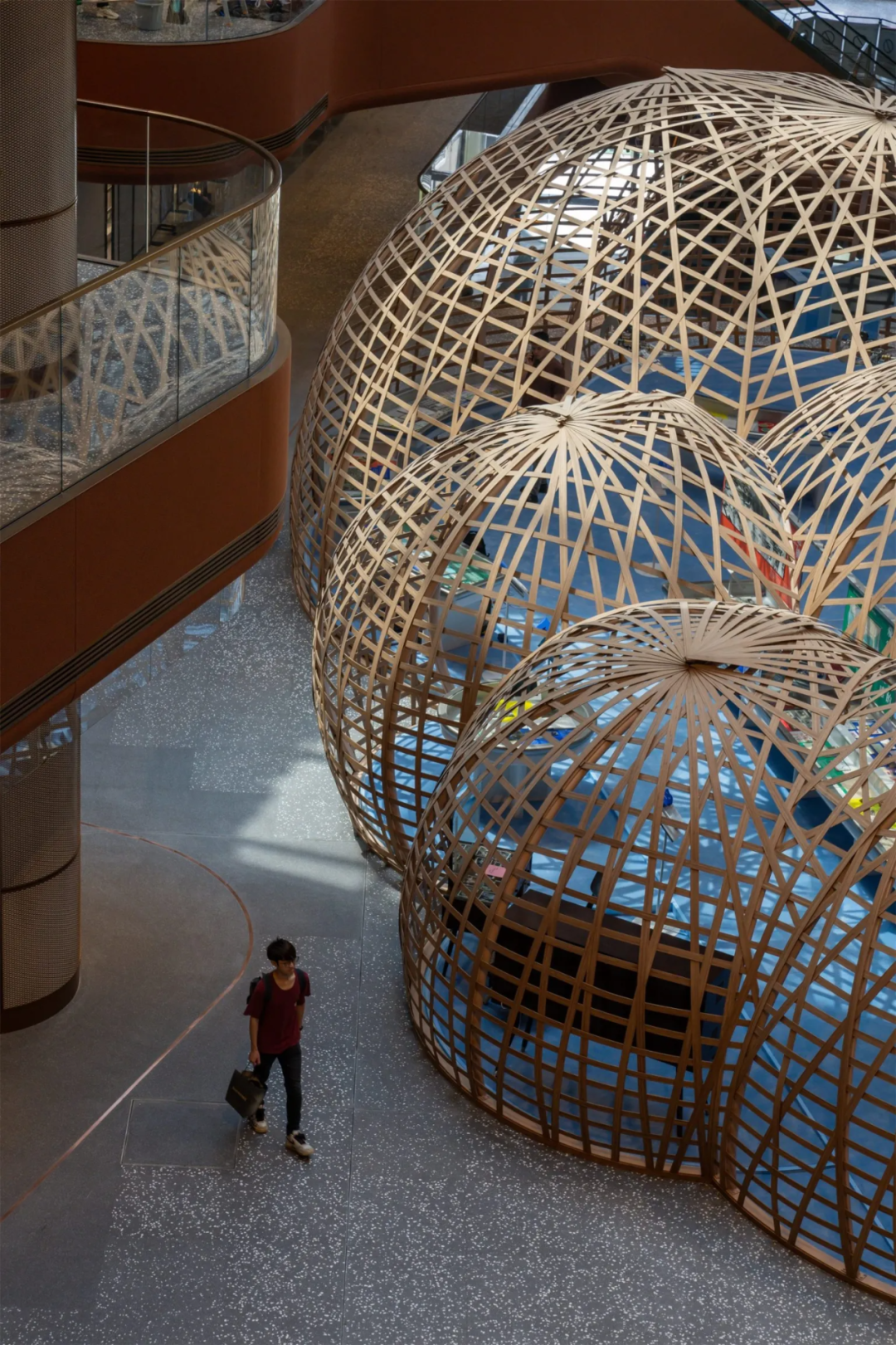The journey begins with a gentle slope as the runway axis, with a number of platforms on both sides branching out. Arriving at the atrium with a generous scale, natural light floods in from the skylight above casting shadows of the bamboo weave.