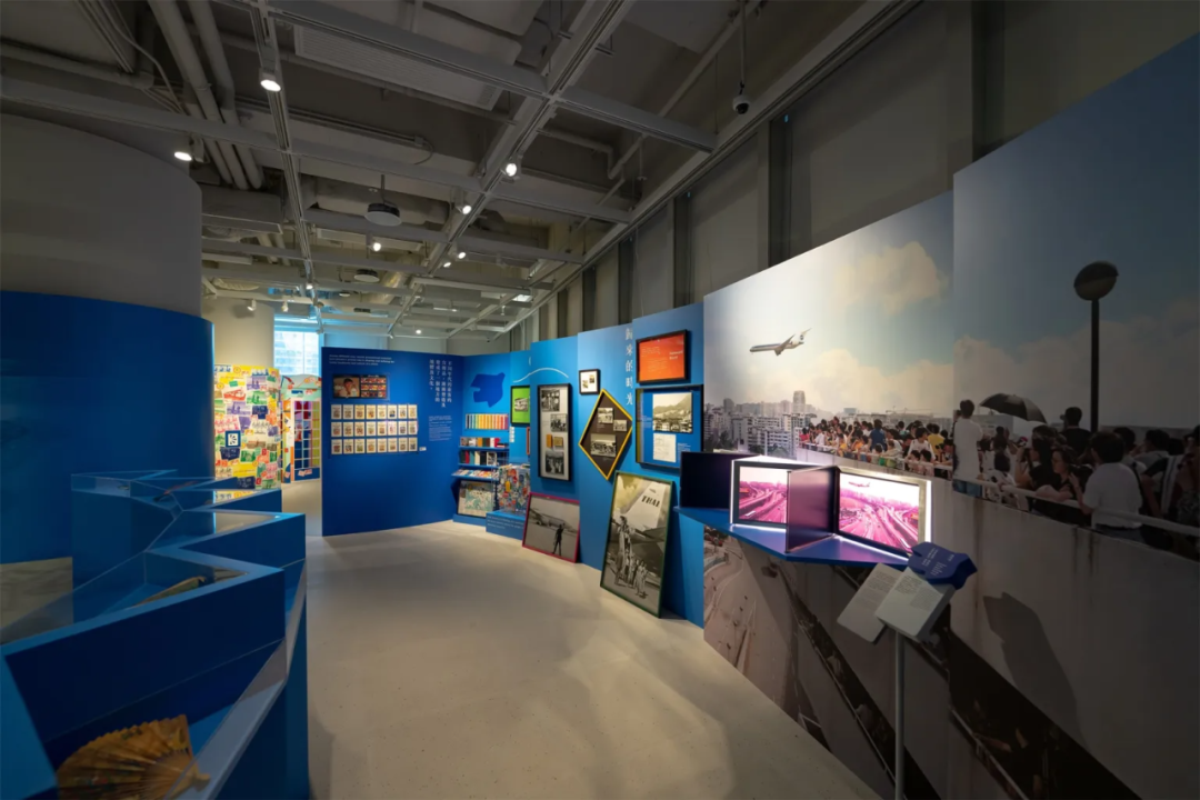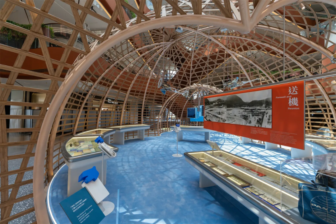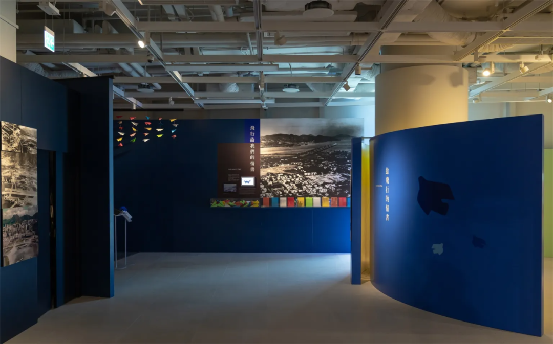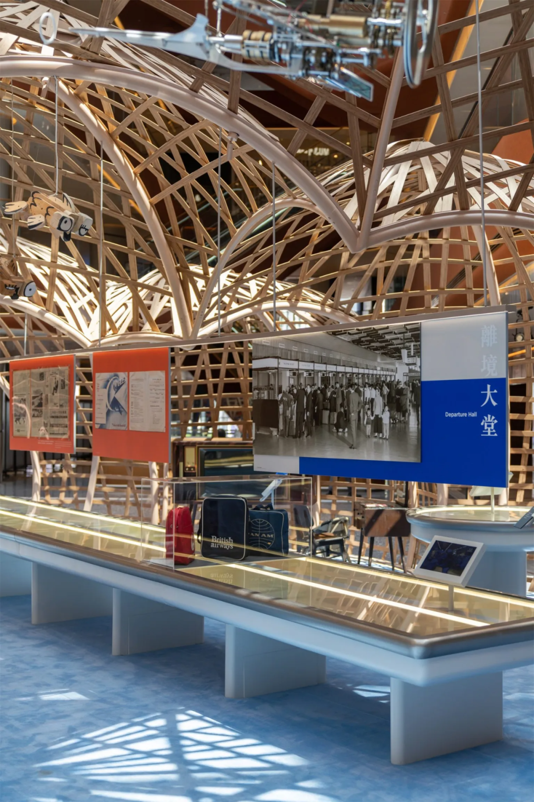 作为中庭展览的续篇,陈列馆以“下降、着陆、回忆和计划下一次旅程”的方式完成了叙事。陈列馆的主题色彩延续了中庭所使用的“天空中”的天蓝色,并进一步过渡到飞机“着陆”时逐渐深邃的夜空蓝。将“几何云”的概念转化为平面布局,陈列馆由一朵朵为每个展览章节量身定制的不同形状的“云”组成。