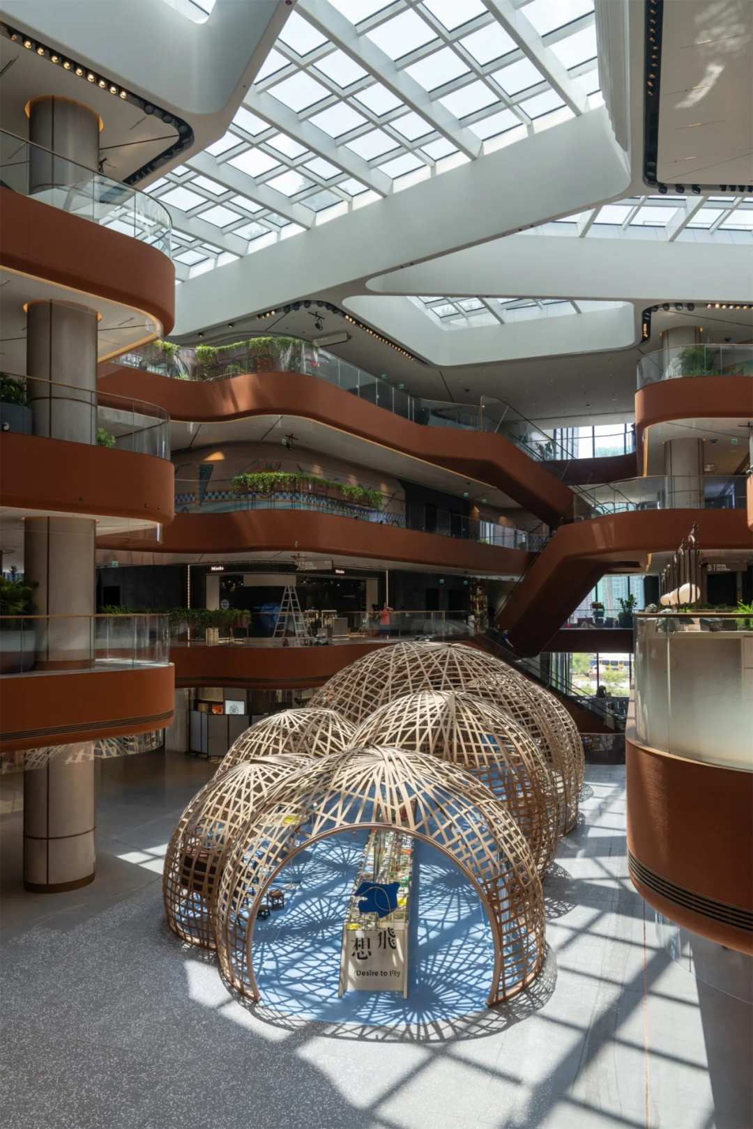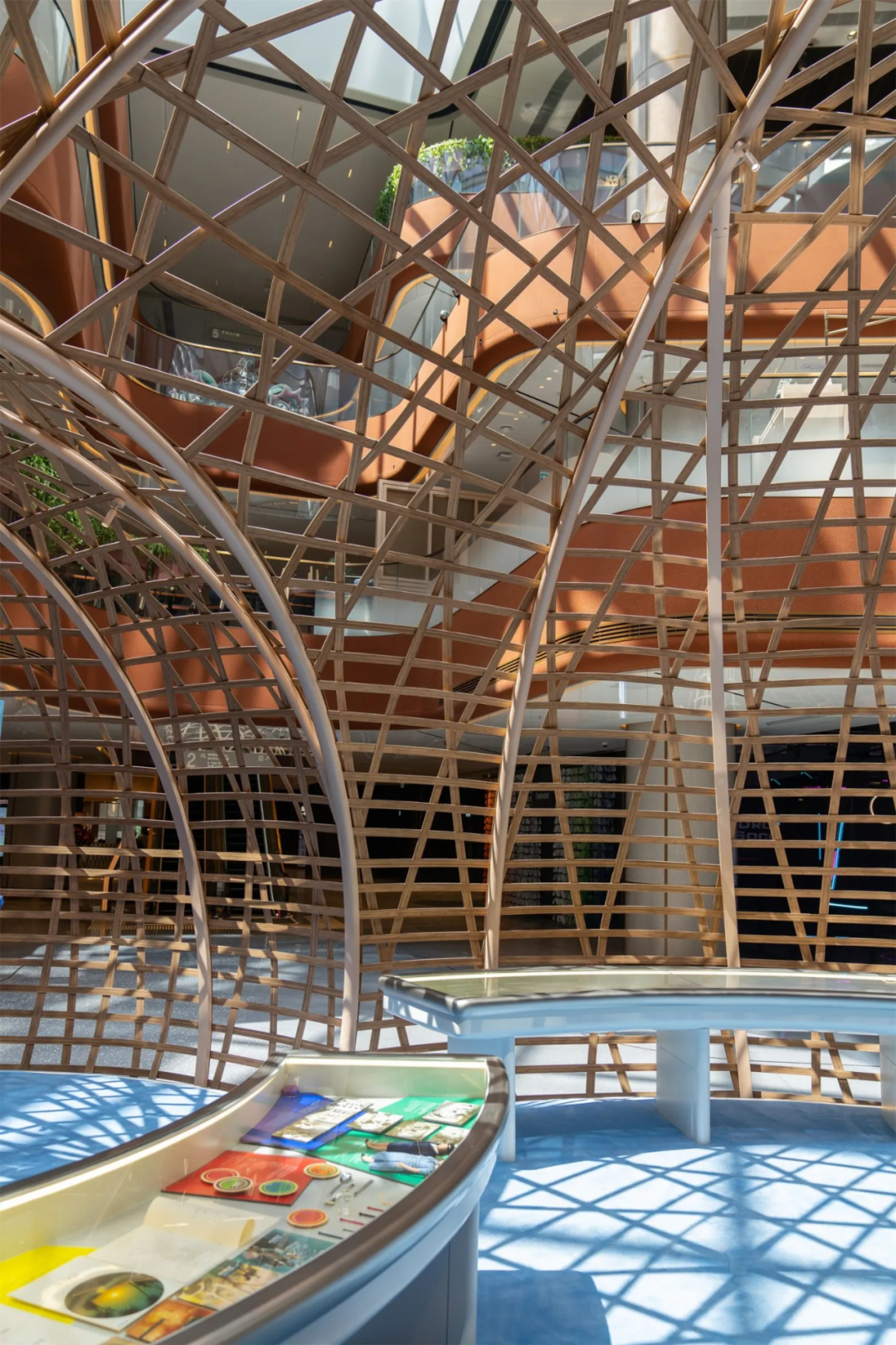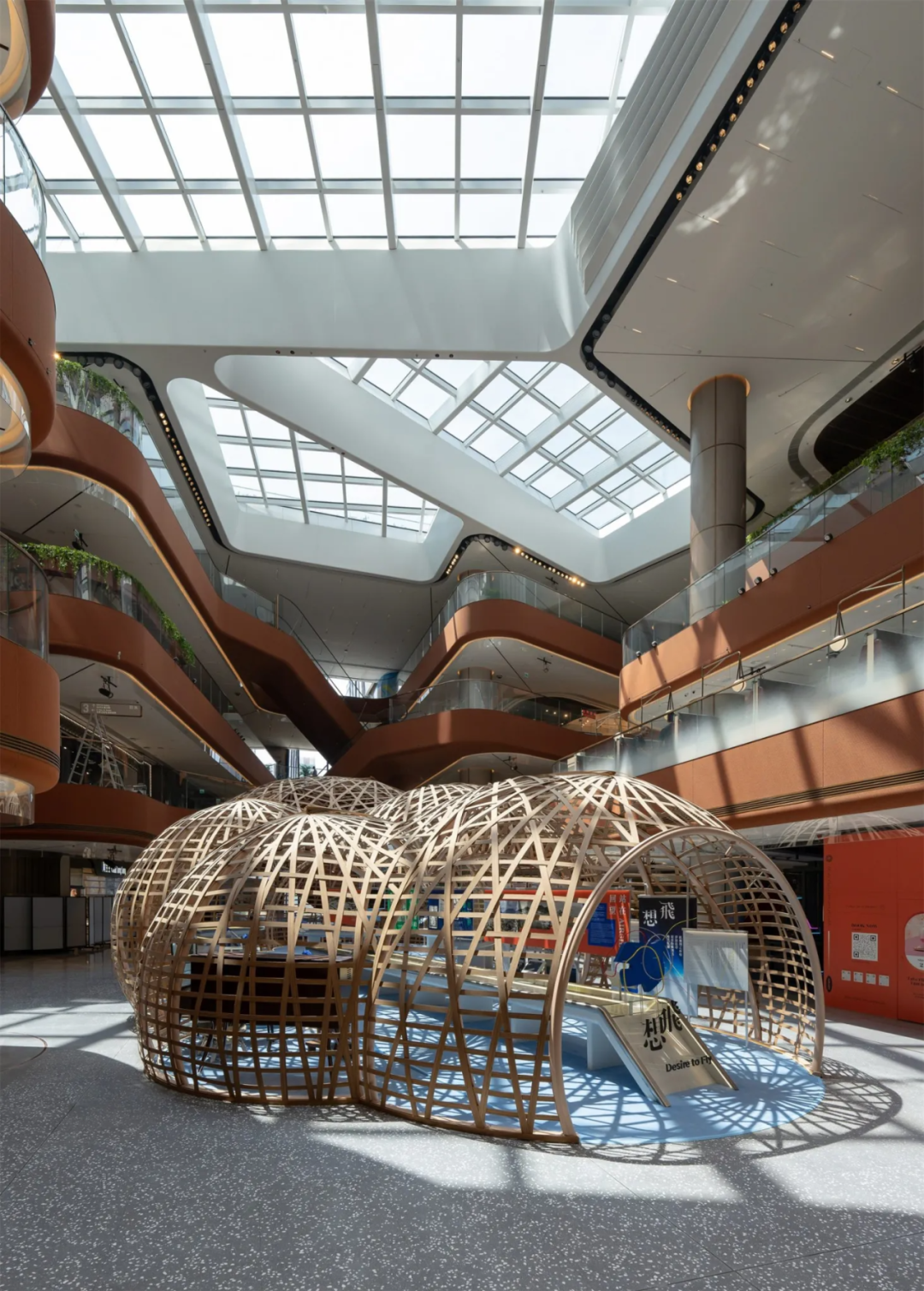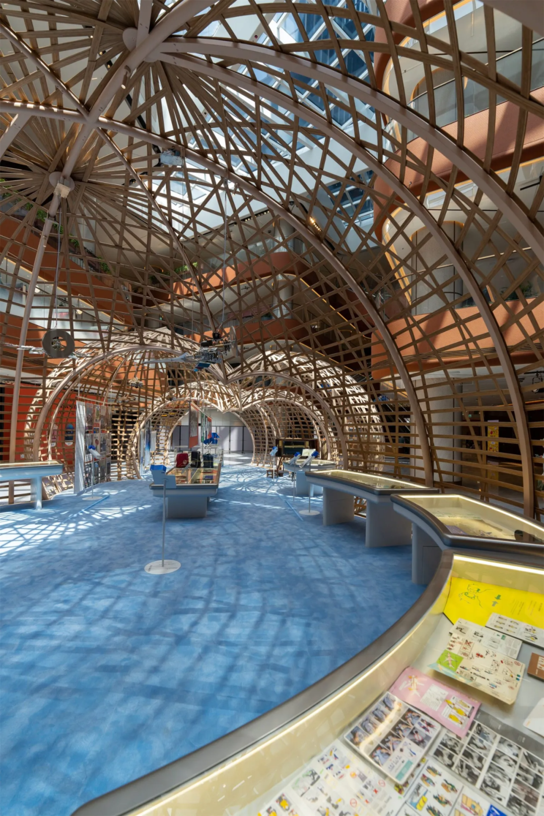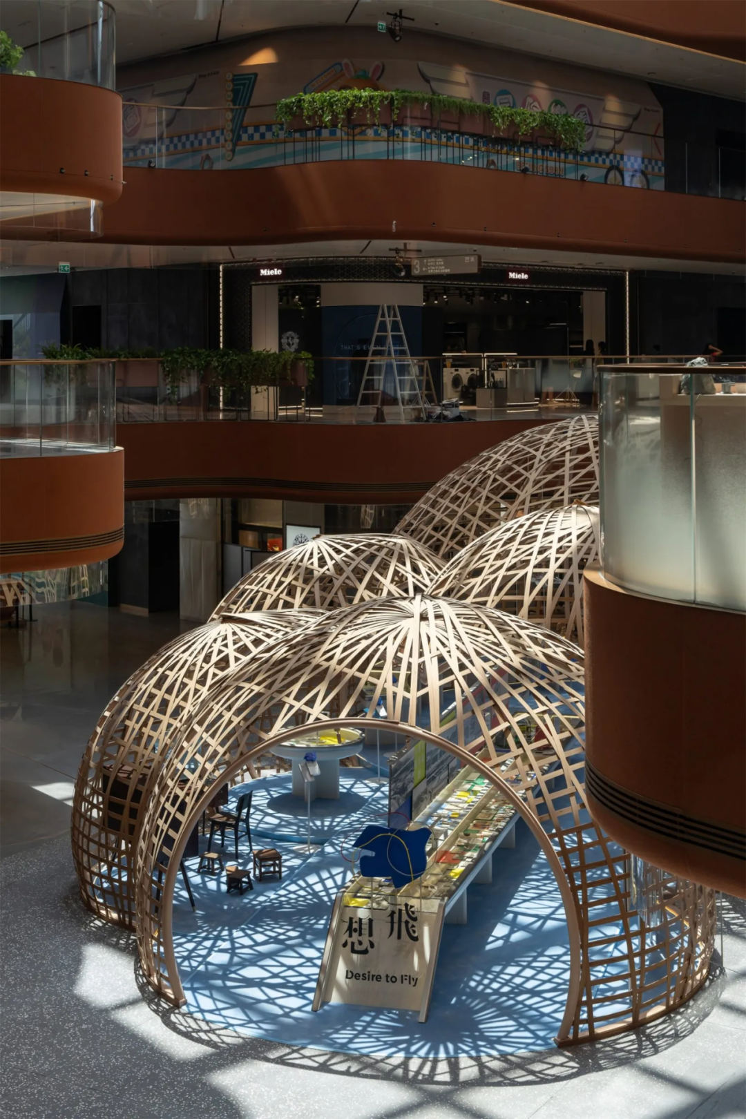 在商场中庭区域,设计师以抽象的“云朵”为概念打造了一个充满趣味的空间。中庭展馆由多个相互交错的“气泡”组成,每个“气泡”都对应着一个主题,将关于飞行的策展故事情节逐一展示出来。