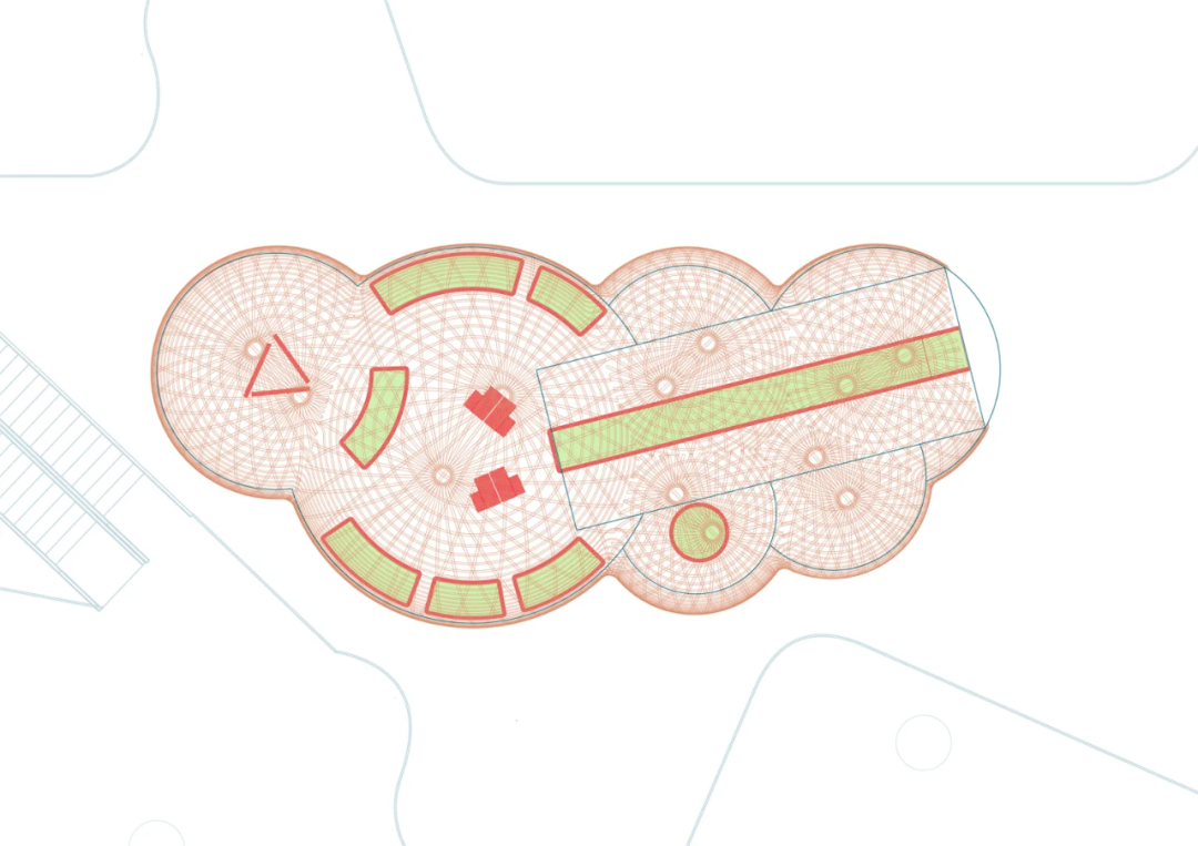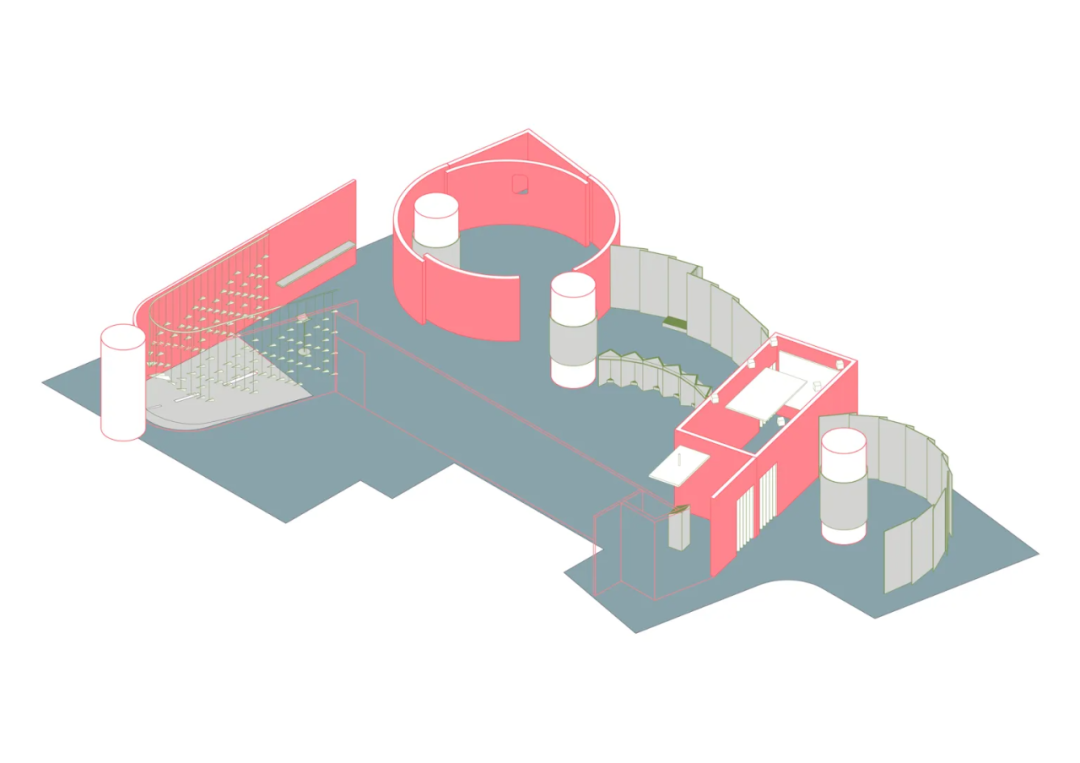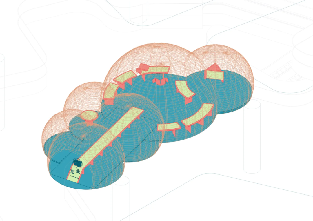 Spatialising the ‘Desire’ (to fly) into comical idea clouds, the atrium exhibition pavilion is composed of multiple intersecting (idea) bubbles. Each of them corresponds to a theme extended from the progressive curatorial storyline about flying, ranging from desiring, learning, taking off to up in the air.