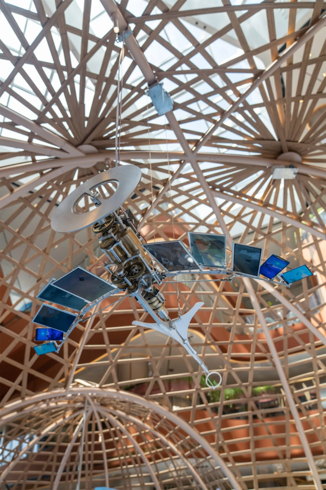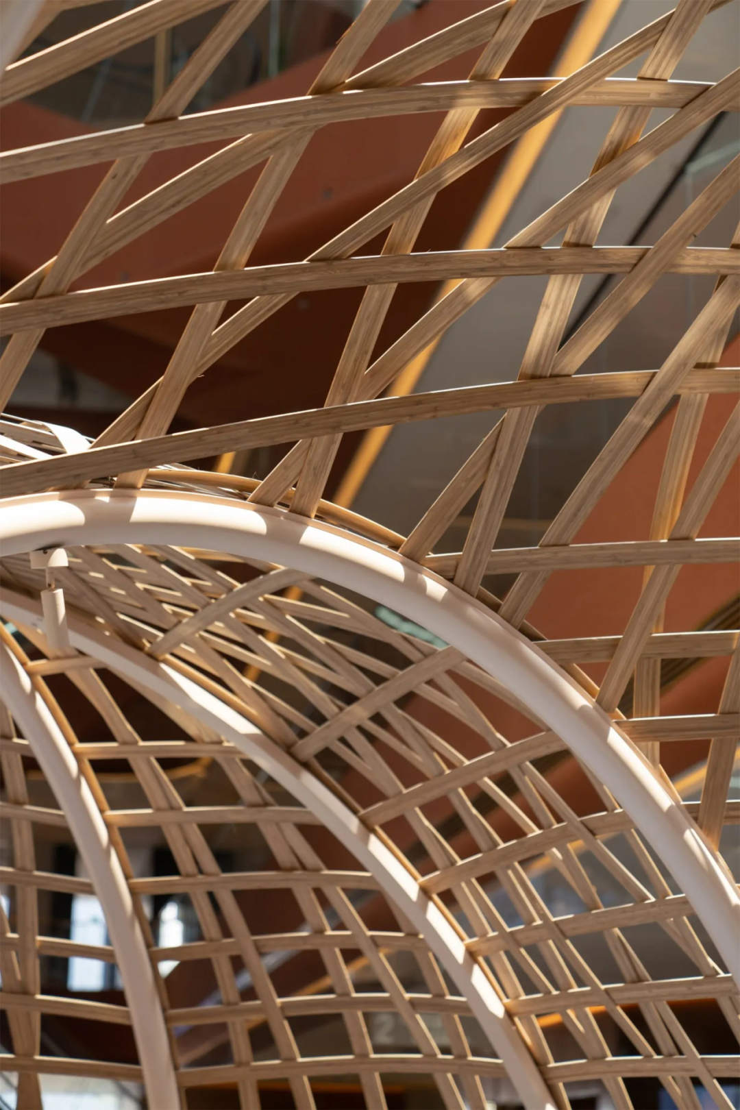 “云朵”由水平竹条和两层偏离中心的垂直竹条编织而成,并由一组最细的钢肋内部结构支撑,以塑造多个球体形态。这一大型的艺术装置总共使用了 6 公里长的竹条,之后它们将被回收并重新用于其他展览和艺术作品之中。