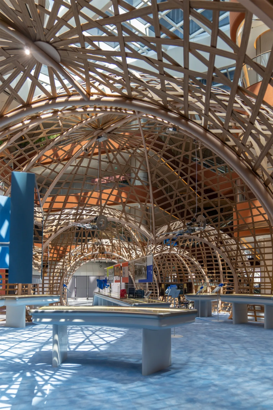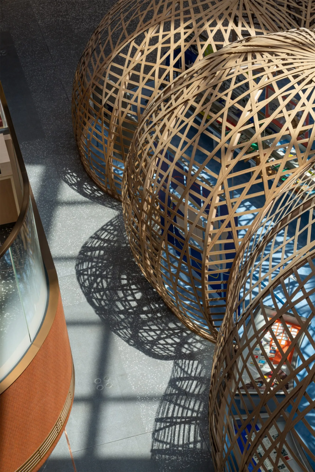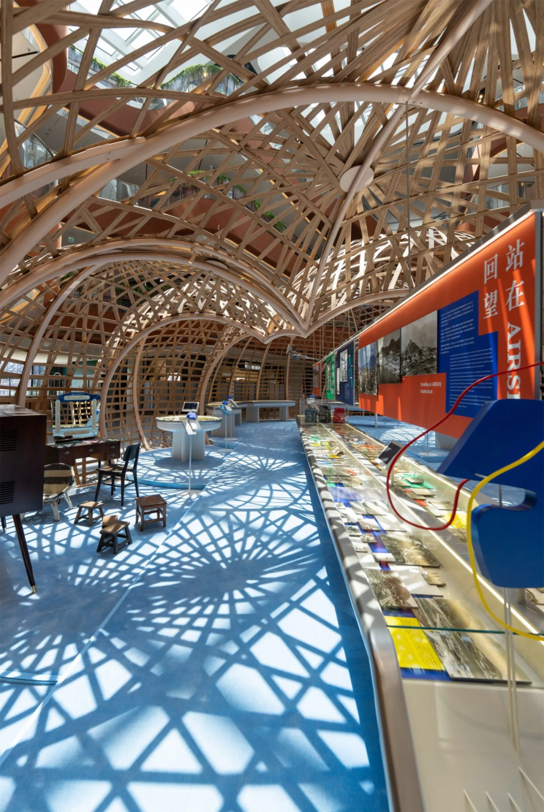 整个展览之旅以一个平缓的斜坡作为跑道轴线开始,两侧有多个平台分支。到达中庭时,自自然光线从上方的天窗照射进来,投射出竹子编织的阴影。