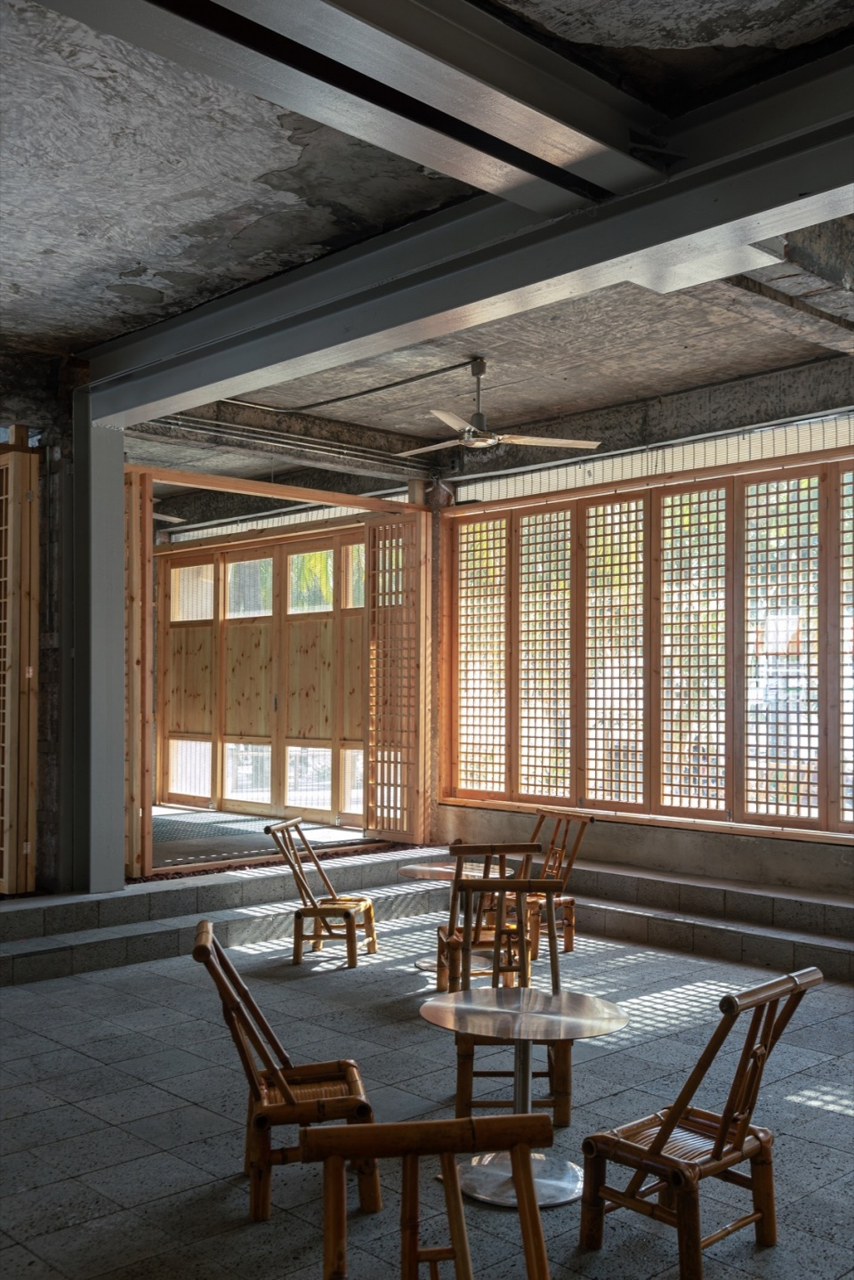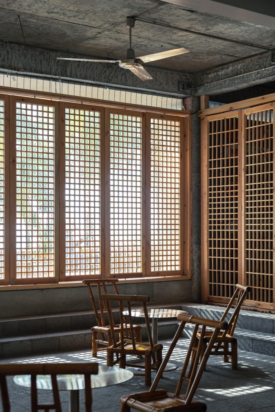 The grille doors around have different opening methods, which organize different spaces and flow lines. As the altitude angle of the sun changes, the light and shadow effects produced by the grille door will also change, allowing people to feel different spatial atmospheres at different times.