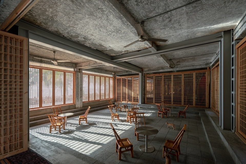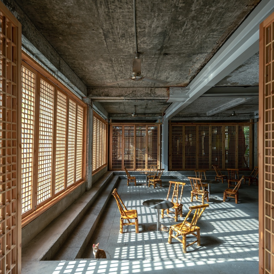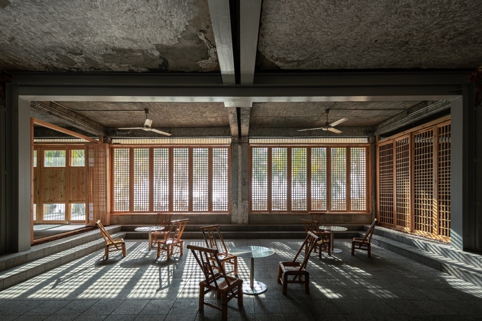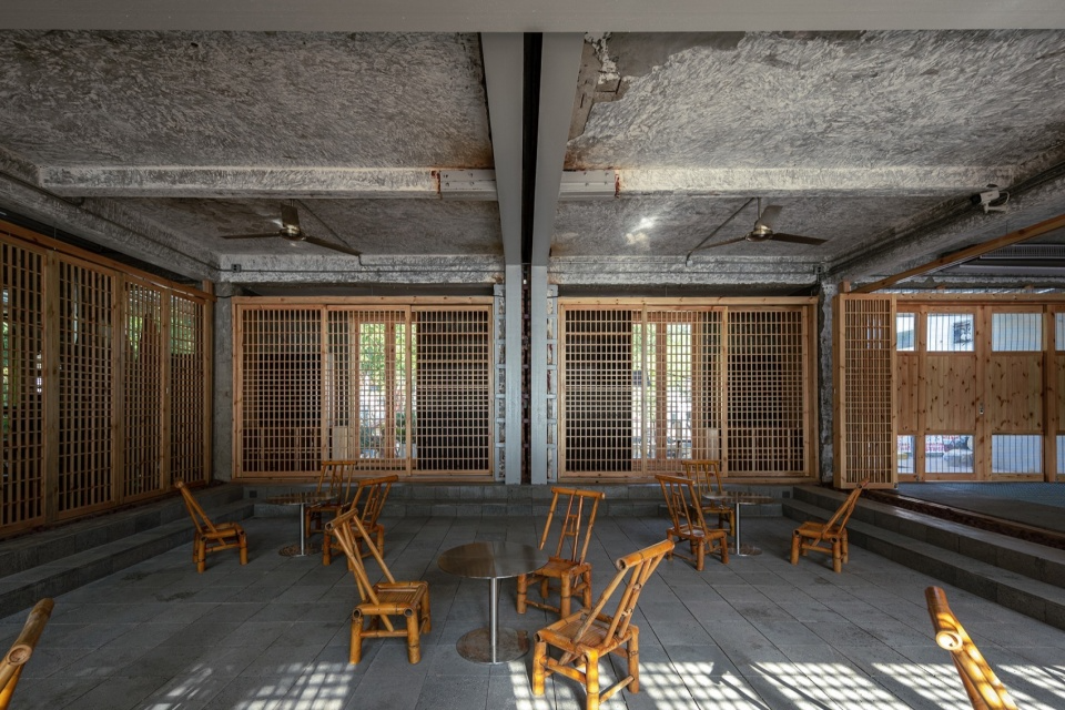 The exterior facade underwent a deconstruction of the original building, which was separated but not completely separated. The roof, doors and windows, and walls have been given new materials, with a separation of 20 centimeters in size, and they are connected to each other by old columns without any decoration. The protruding wall wraps around the roof drain pipe, and the newly added eaves create a transition between indoor and outdoor spaces. The raised roof creates a high space inside, while also giving the facade a rhythmic change, rather than a single array, making it one of the focal points of street design.