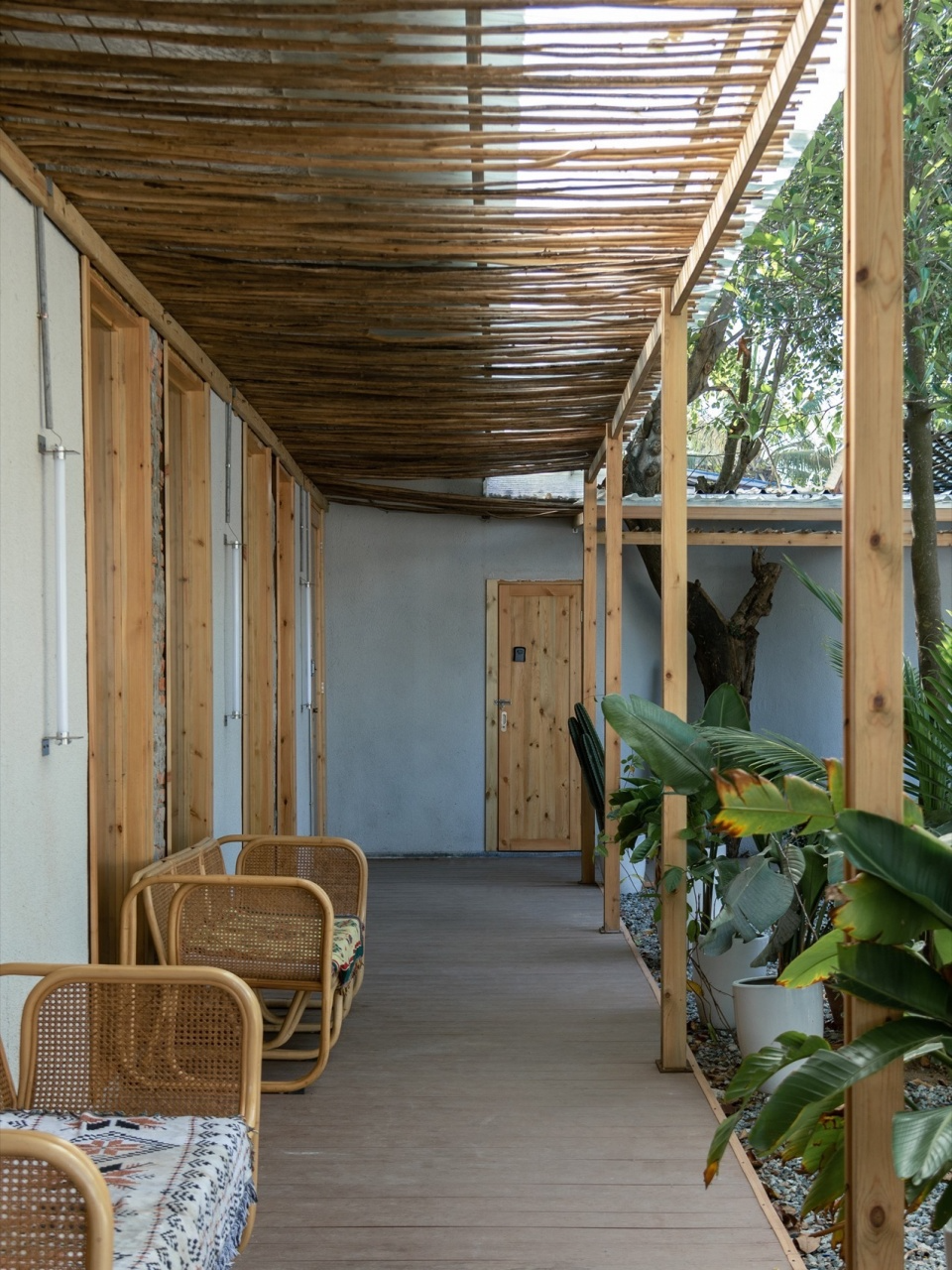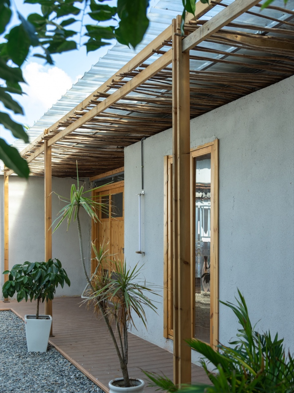后院原有屋檐尺寸为1.3m深3.2m高,在使用或美观比例上都有些尴尬,既达不到遮阳挡雨的作用也不好看。后院的长廊具备动线与外摆的功能,连接着厕所,后院公共活动区,刚好化解掉这尴尬的屋檐。用木结构在原有屋檐下做“加法”降低屋檐高度至2.8m使尺寸更宜人,延长屋檐至2.2m深,在满足外摆餐位的深度下还能让人舒适的通过。