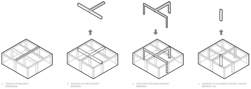 多功能区具备着演出,沙龙,展览,放映,餐饮等模式,我们把多功能区布置在两栋建筑的交界处,一是为满足功能分区的面积占比,二是为了“偷梁拆柱“。原有柱跨不能满足功能使用需求,需要创造一个无柱空间,利用建筑边跨与双梁单柱的特性,通过结构的处理把中心原有的柱子拆除。为了满足7.5米跨度的钢梁,我们拆除原有部分混凝土梁与柱子,加设钢结构满足结构支撑。