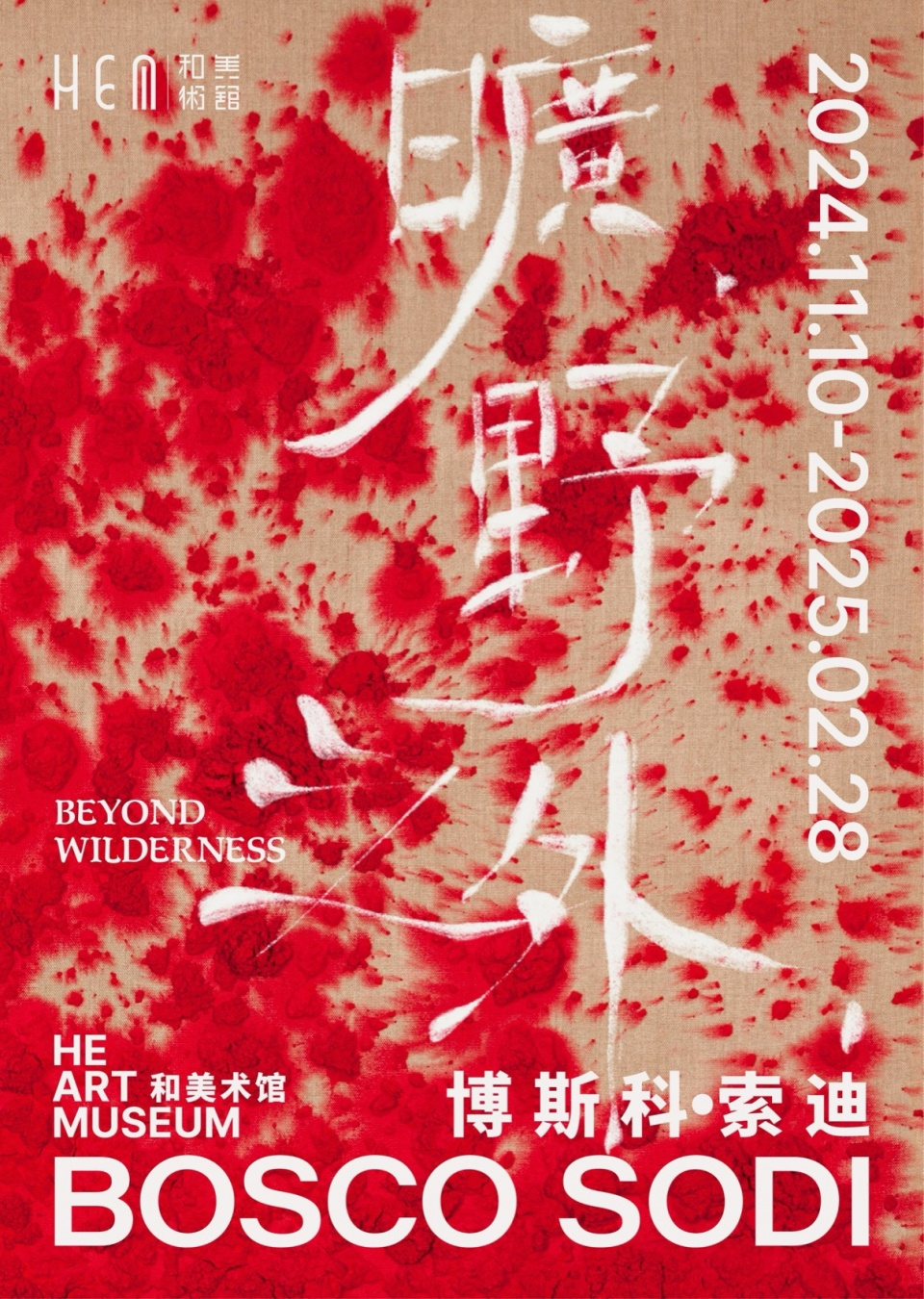 2024 年 11 月 10 日起,和美术馆(HEM)呈现博斯科·索迪(Bosco Sodi)迄今为止于亚洲举办的最大规模个展“旷野之外”。展览由和美术馆与艺术家共同策划,展示艺术家涵盖绘画、雕塑及场域特定装置等在内的的百余件作品。展览将索迪的作品置于和美术馆建筑内外,通过地域、空间与作品的互动重新诠释艺术家取材自然旷野,以身体的介入将天然物质升华的创作哲学。