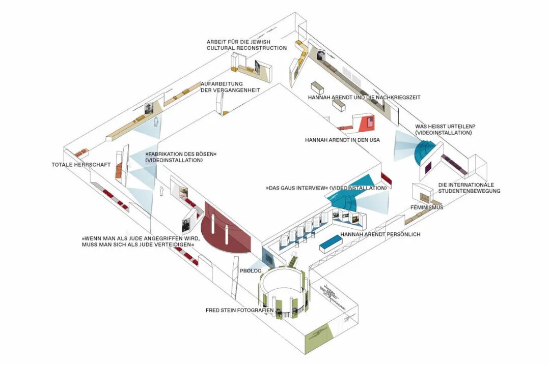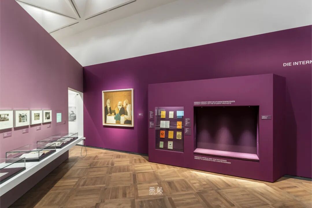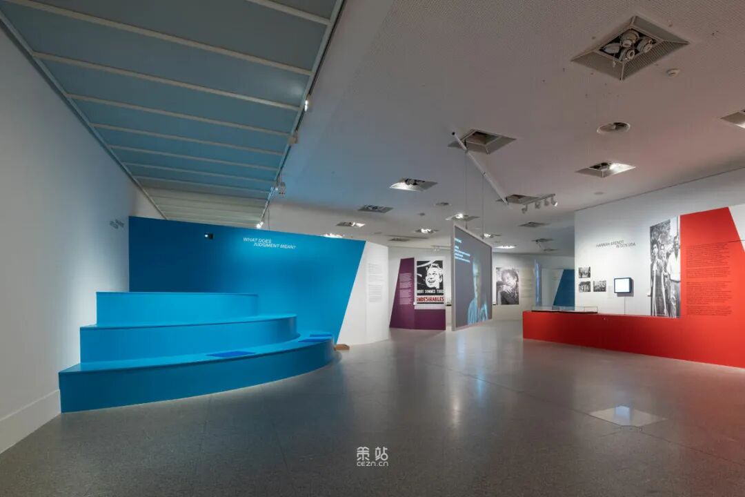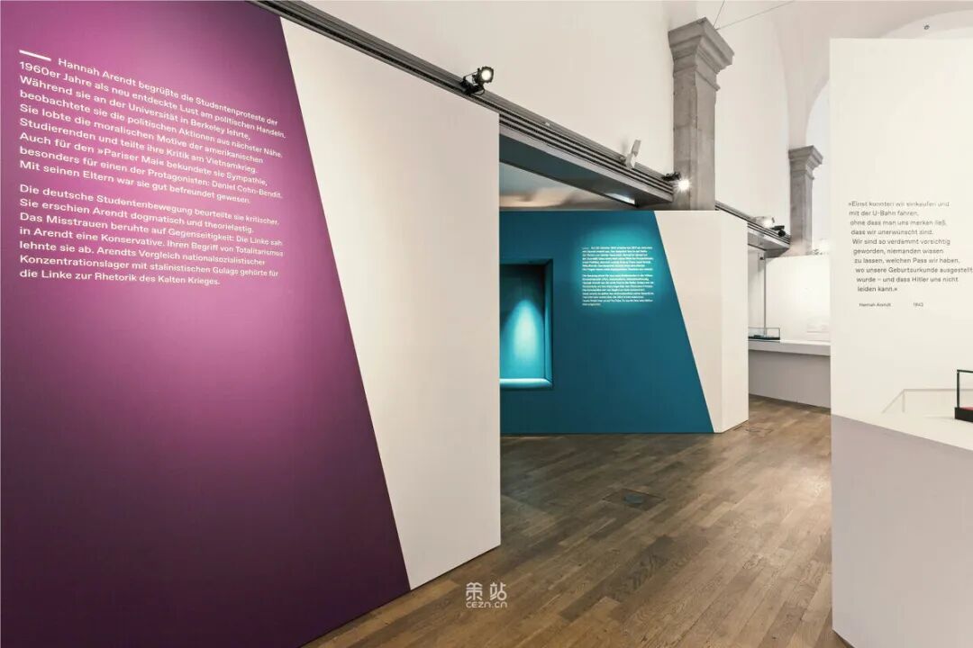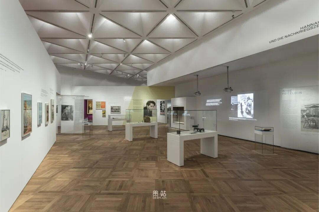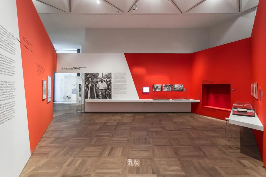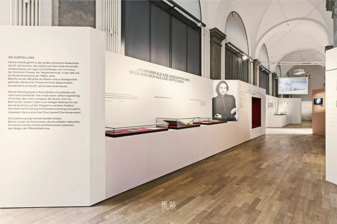 Chezweitz 在两层楼上建造了一个空间结构,沿着策展人明确提出的主题组织参观。其结果是一个建成的、可步行的、三维的网络,开辟了令人兴奋的空间、多样化的参考和视角。图形和媒体的巧妙运用使得展览设计能够为主题的严肃性提供空间,同时允许对汉娜·阿伦特这个人的非常个人化的看法。