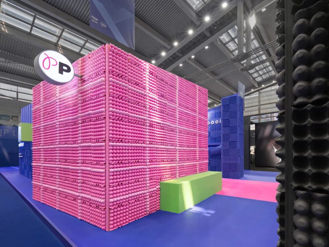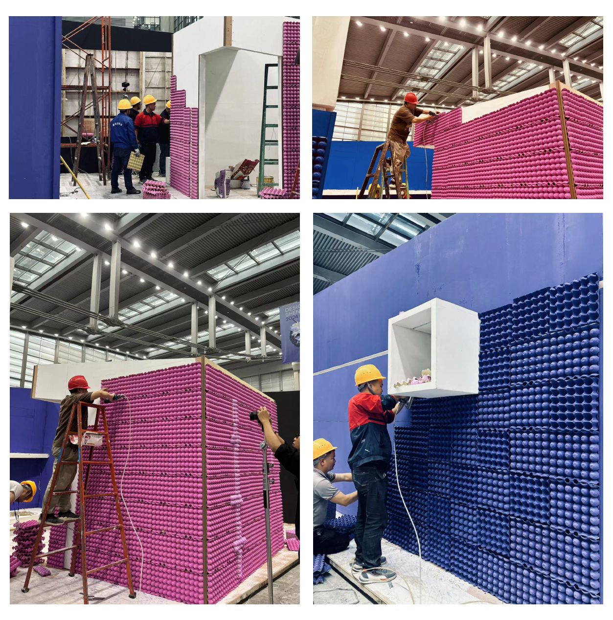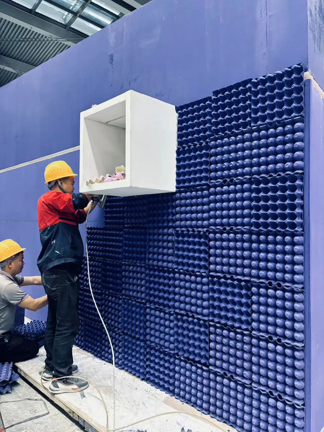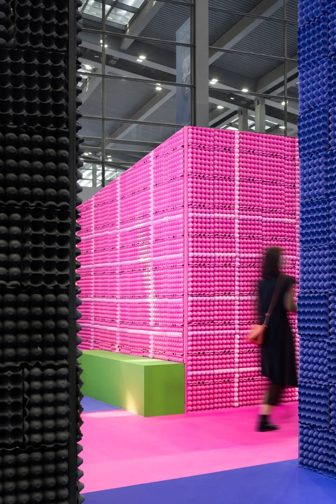 Due to the use of special non-standard decorative materials, the exhibition hall is also full of challenges during the landing stage. Mao Hua talked about the construction process and said, "We didn't explicitly tell the workers which part of the egg tray was positive and which part was negative. Instead, we allowed them to freely participate in the design during installation. This collaborative process was very interesting."