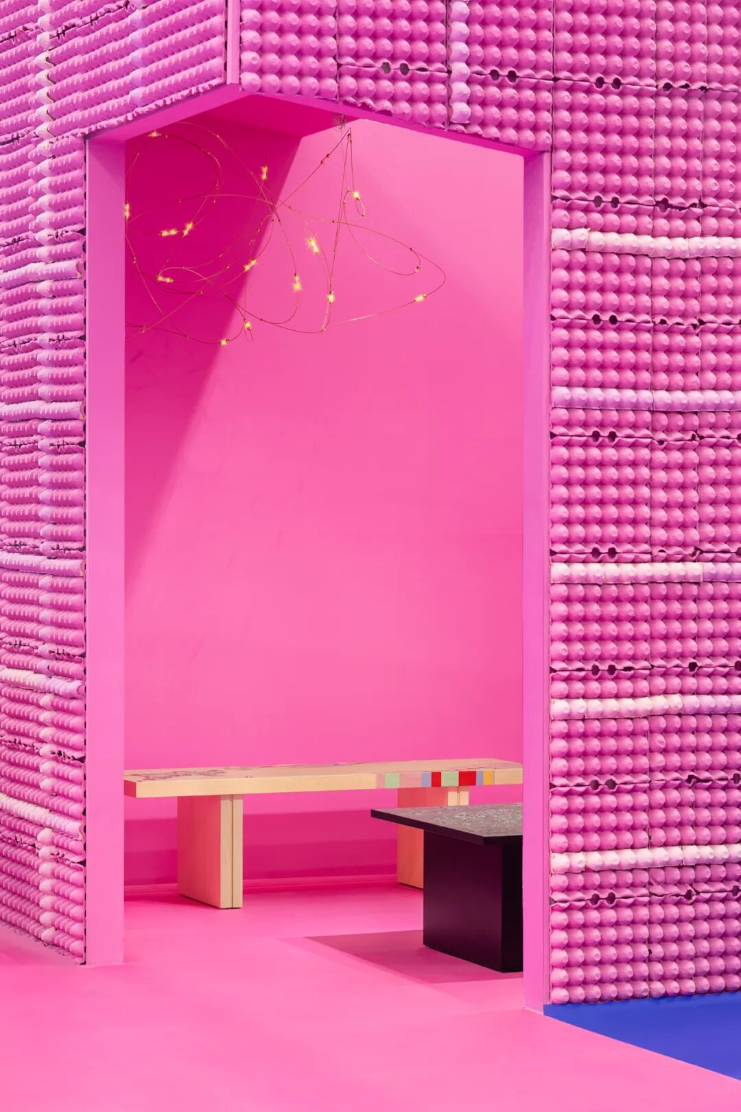 In this unique exhibition, the audience will have the opportunity to have a unique "dialogue" with furniture, a "show", but it is the visitors who walk on the overpass. In the design of the exhibition hall, the Yikai design team attempts to exchange the binary of "exhibition" and "observation", connecting the exhibition hall with a bright pink overpass, inviting visitors to step into the runway.