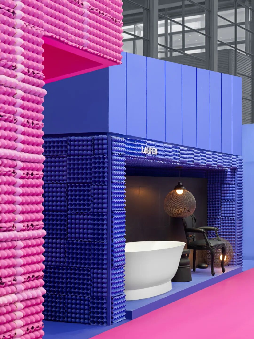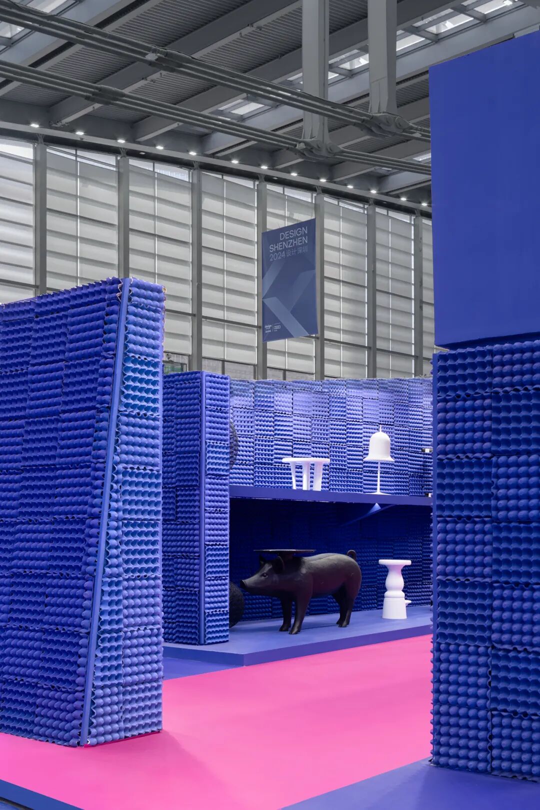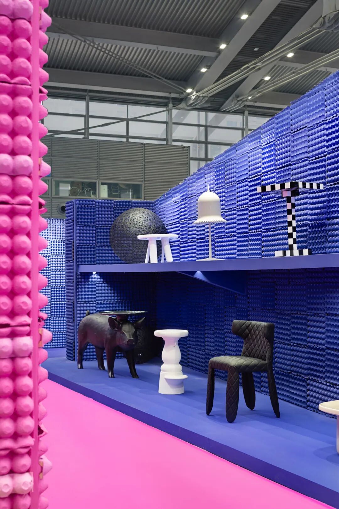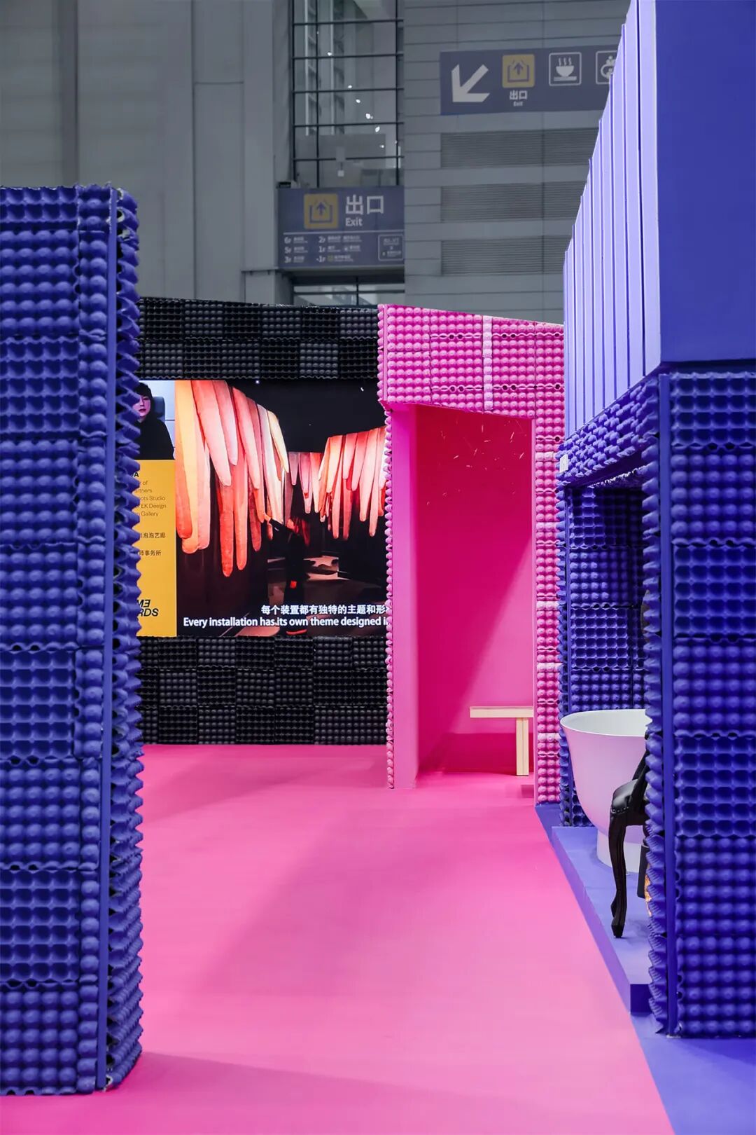 蓝、粉、黑3个不同体块构成的展区中,沿“天桥”依次排布,展示着来自泡泡艺廊、Moooi、CASA BRAVA 意美家、瑞士LAUFEN 3个不同品牌的艺术化产品。为观者展现日常生活中使用的器具,亦可拥有艺术质感。