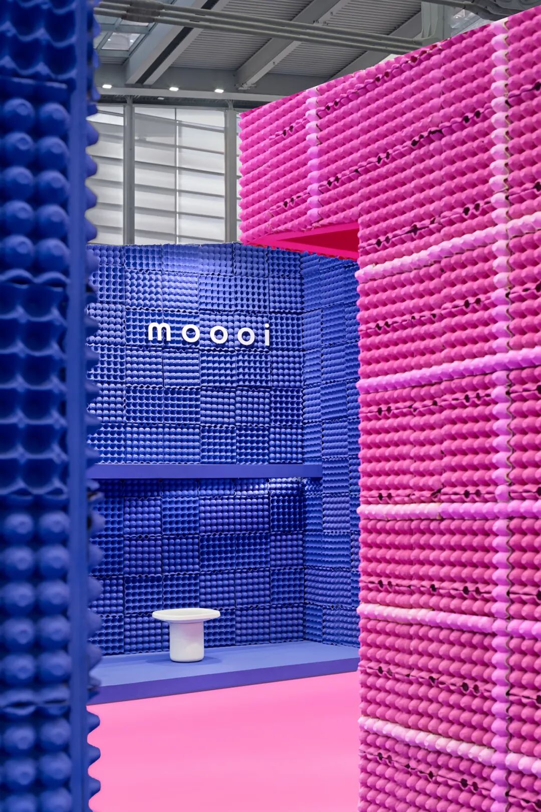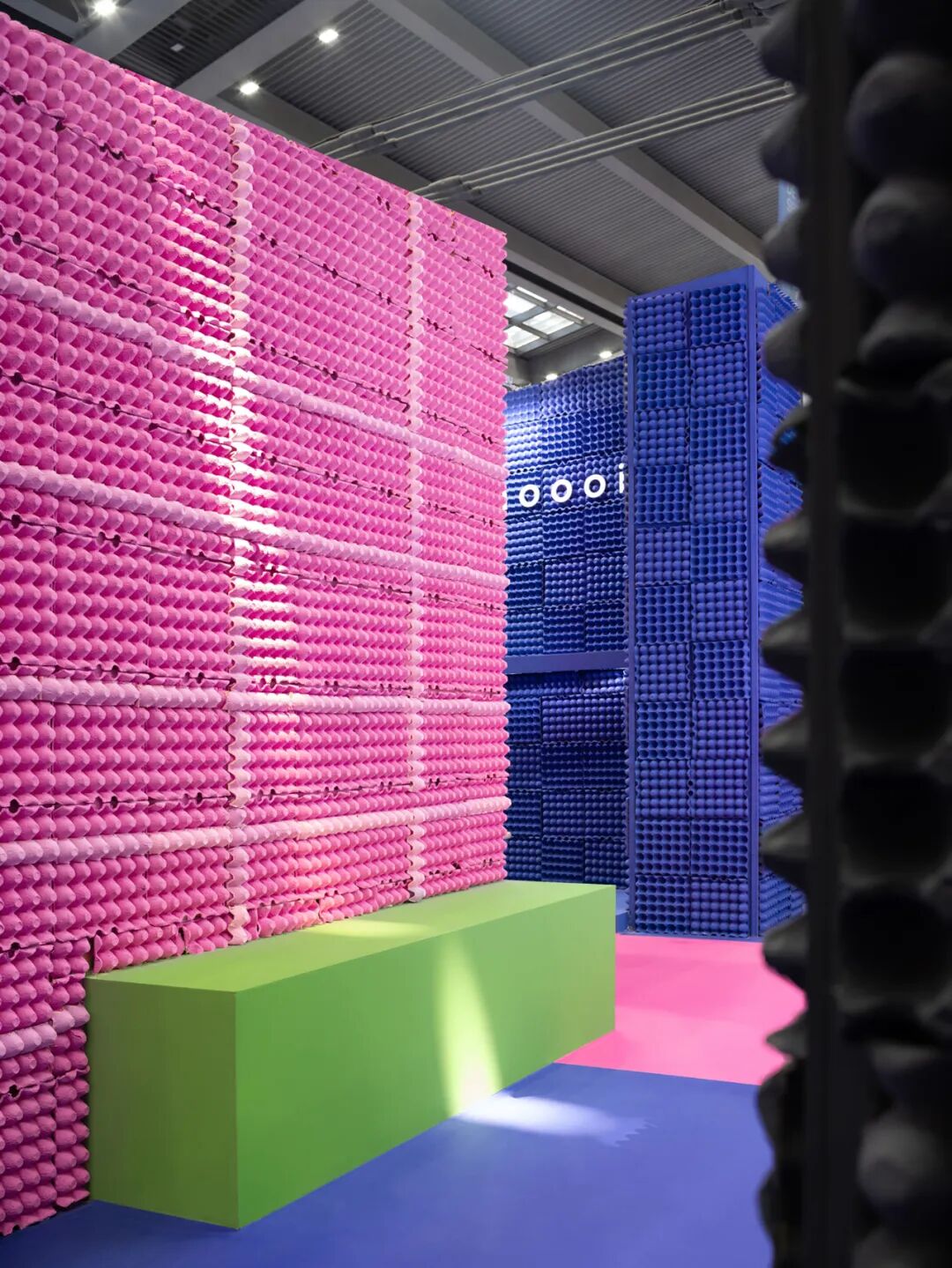 虽然设计时间非常有限,但异开设计还是希望在有限的时间里打造出一些特色。选择鸡蛋托这一特殊材料,不仅顺应当前可持续发展的趋势,而且能够引发行业思考。异开设计将蛋托进行喷涂后,上墙拼装,借由蛋托正反两面不同的构造模式,让展厅墙面形成了错落有致的特殊肌理。结合大胆的色彩应用,令人印象深刻。