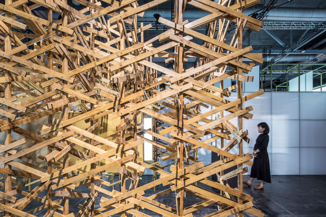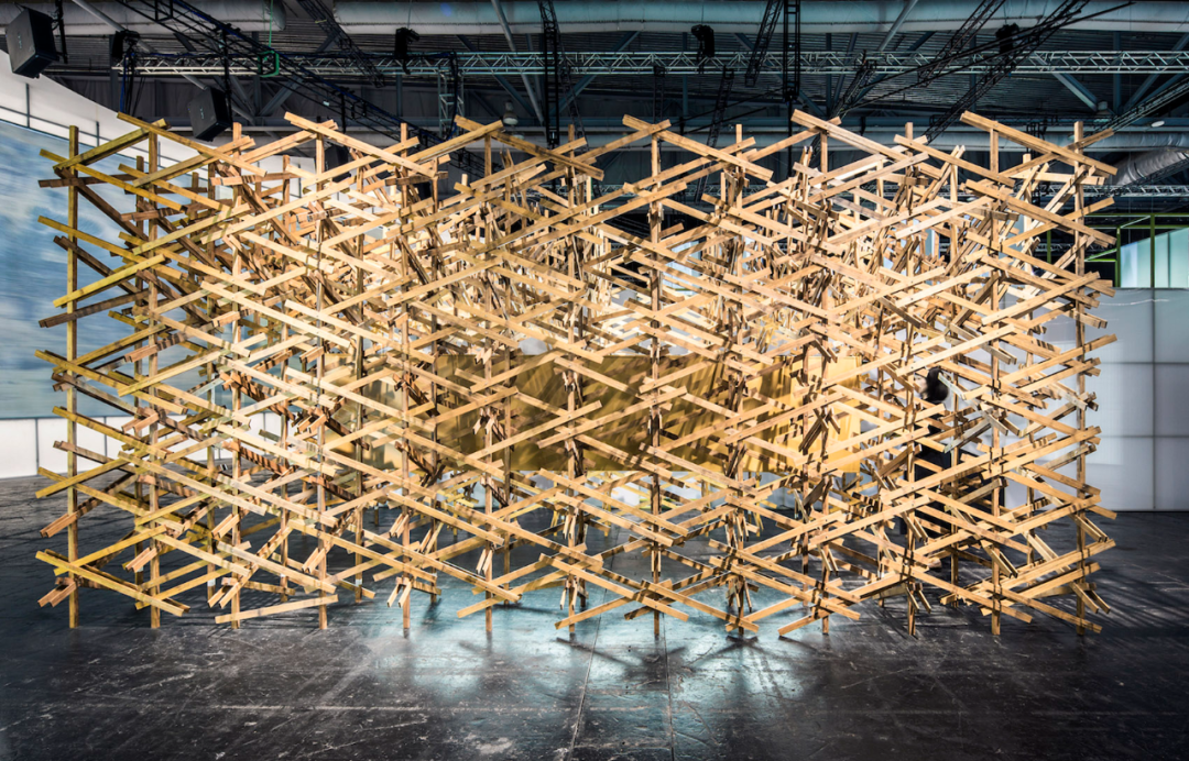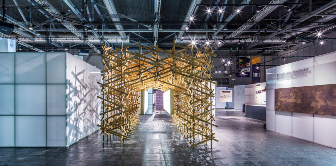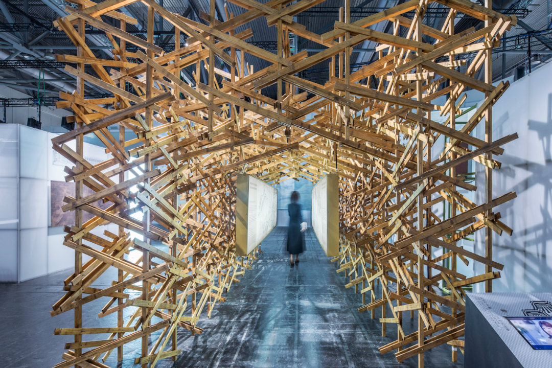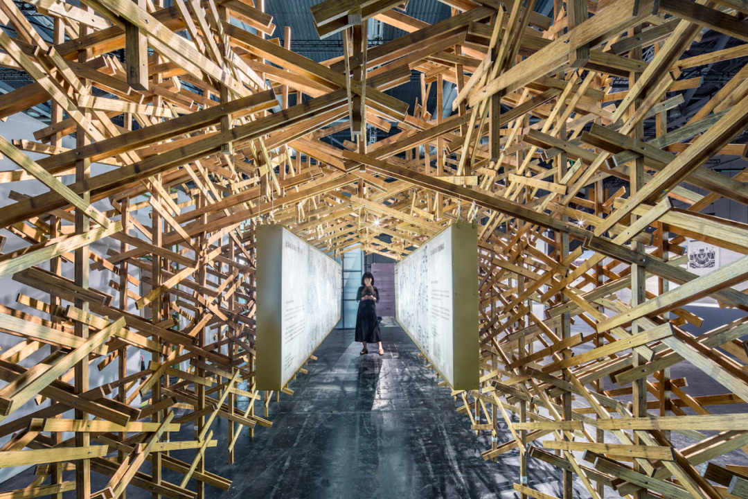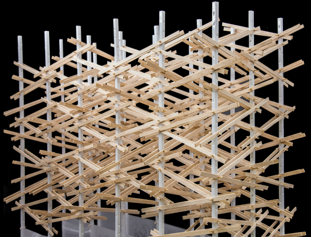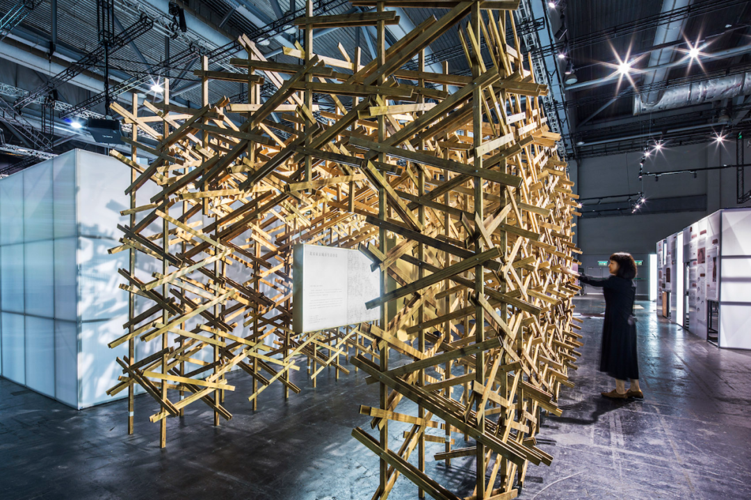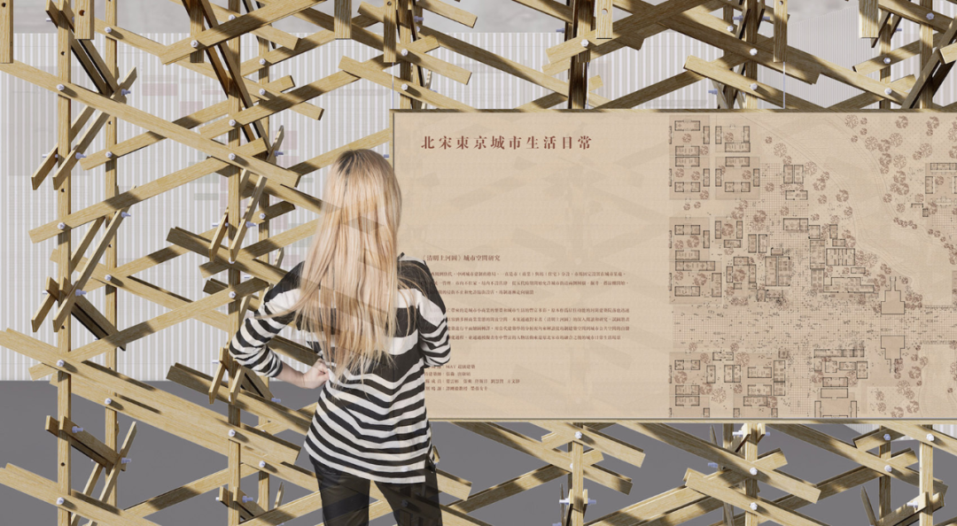 这个空间装置采用了大量在中国传统木作营造体系中不常见的斜撑、三角支撑以及绳索绑缚等方式。通过这种结构,他们试图还原宋代建筑中“彩楼欢门”的形象,以展示北宋城市空间格局的特征,并将其呈现在展览中,以此突出他们的研究成果。
