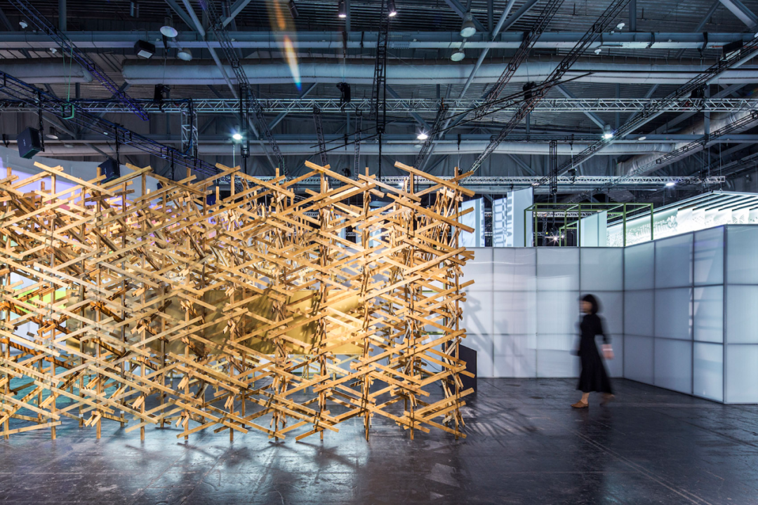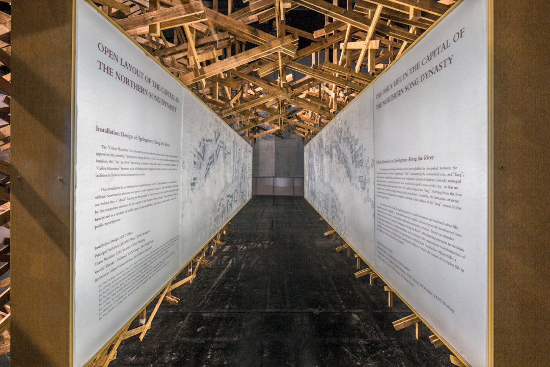 MAT超级建筑事务所创作了一个长6米、宽3米、高3米的空间装置,以宋画《清明上河图》中的“彩楼欢门”为原型。在这幅画中,“彩楼欢门”出现在酒肆门口,通常为二层高的门楼,由竹子绑扎而成,象征着“空中楼阁”的意象,成为酒食店的标志。