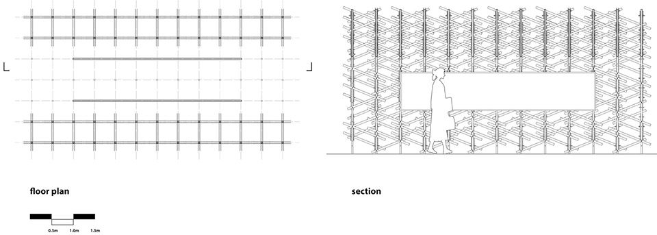 MAT超级建筑事务所对“彩楼欢门”的当代性设计转译十分巧妙:他们放大了构建元素中的“斜撑”,并通过螺栓将小型的竹钢构件上下交错连接,最终呈现出一个悬浮于地面的“云”装置。这个装置的中间留出通道,用来悬挂北宋东京城市开放布局研究的绘图成果。