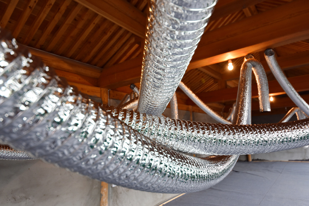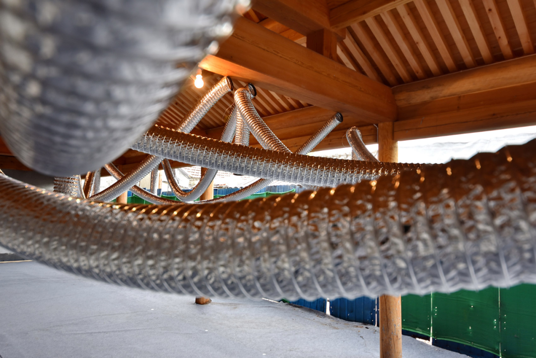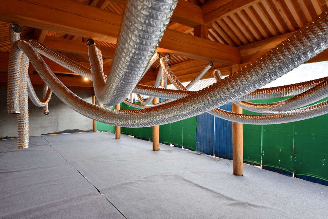 "外墙风口 | Exterior Wall Outlet" 展示了清筑建筑对北京胡同的研究成果。他们通过观察现状,提出了适用于胡同风貌的功能产品,并以产品实物为主,采用风管与风帽组合成装置进行展出,探索了“营造工艺科学化”的更新思路。