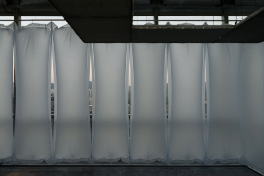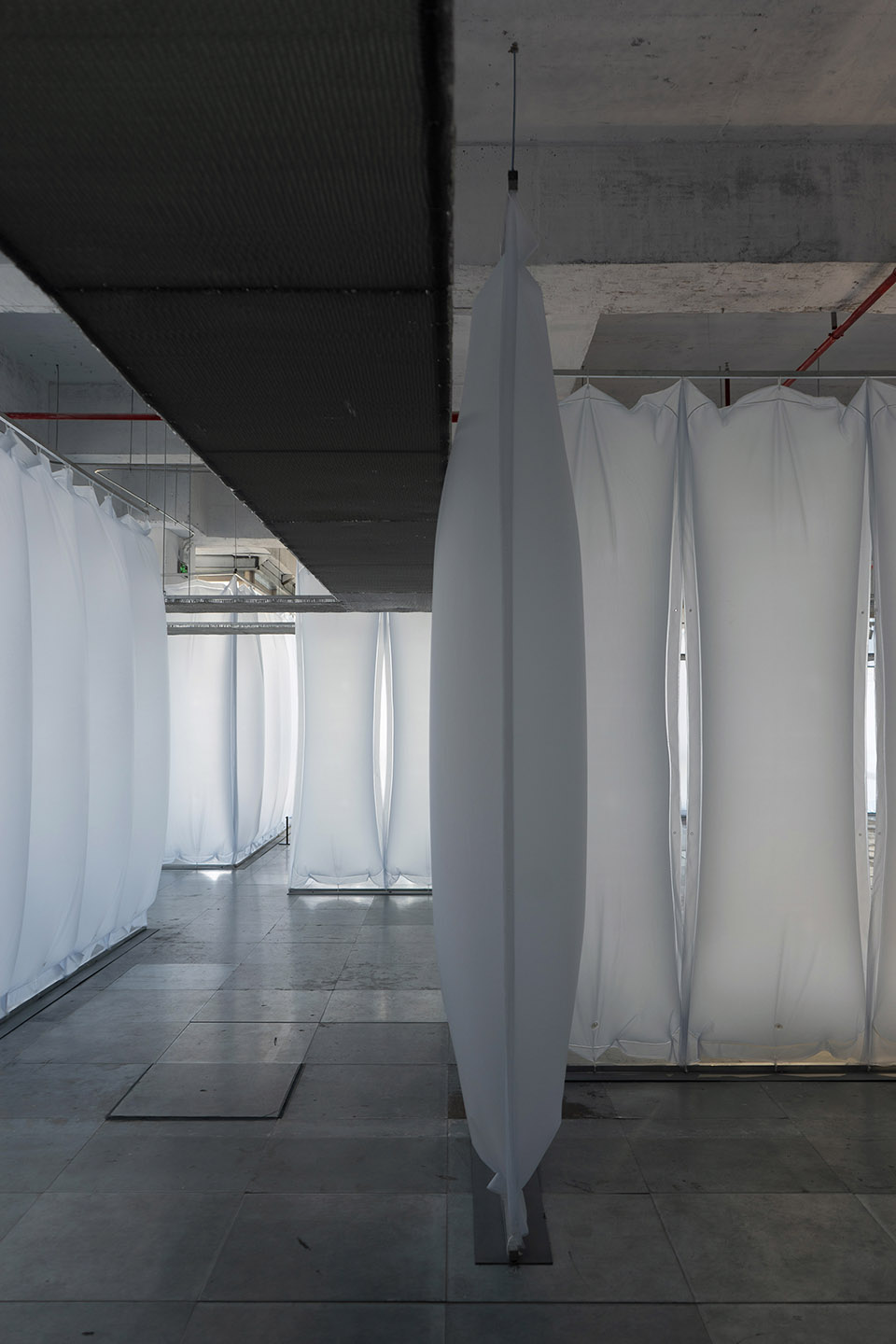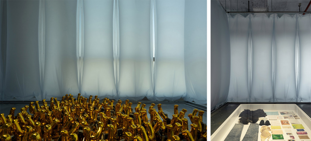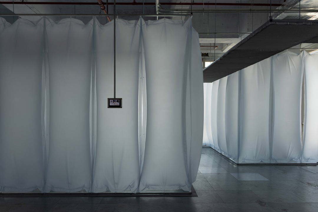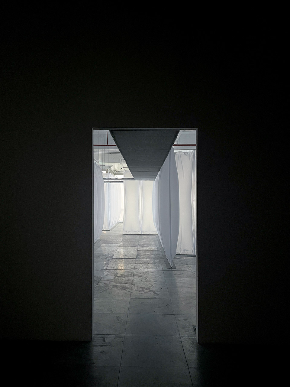At the moment when the mirror curtain of the lobby was lifted, the audience entered the main exhibition space surrounded by semi transparent PVC inflatable material. After being enveloped, the air reverses into a carrier that shapes space, as if enveloping the boundaries of a dream. 78 ultra sized inflatable pillows with dimensions of 750x2800x400mm provide a hazy appearance and soft touch, soothing the heart while also conveying fragility and nothingness. The exhibition hall is like a freely flowing virtual and real field, juxtaposed with independent dream fragments detached from urban space. The audience temporarily forgets their roles and backgrounds within the urban community, and enters a time and space of examining themselves and artworks.
