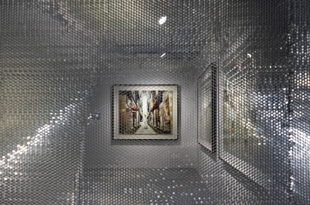 An aluminum honeycomb core roof corridor extends from the entrance to the entire main exhibition hall space, transforming the tail hall into an fa ç ade, guiding the audience's viewing flow while also leading the narrative rhythm of the space. The front facade of the aluminum honeycomb core allows for a panoramic view of the urban landscape on one side and an artwork on the other. As the audience moves, the viewing angle constantly changes, and the material presents a metallic texture and reflects nearby scenery and light. The constantly changing natural light and the wandering figures of other viewers throughout the day are reflected on the aluminum honeycomb core wall, creating a dynamic light and shadow texture. During the exhibition, the audience will encounter visual memories that only belong to this moment and this place. This design not only adds visual depth and fun to the exhibition, but also provides the audience with an interactive experience with the work.