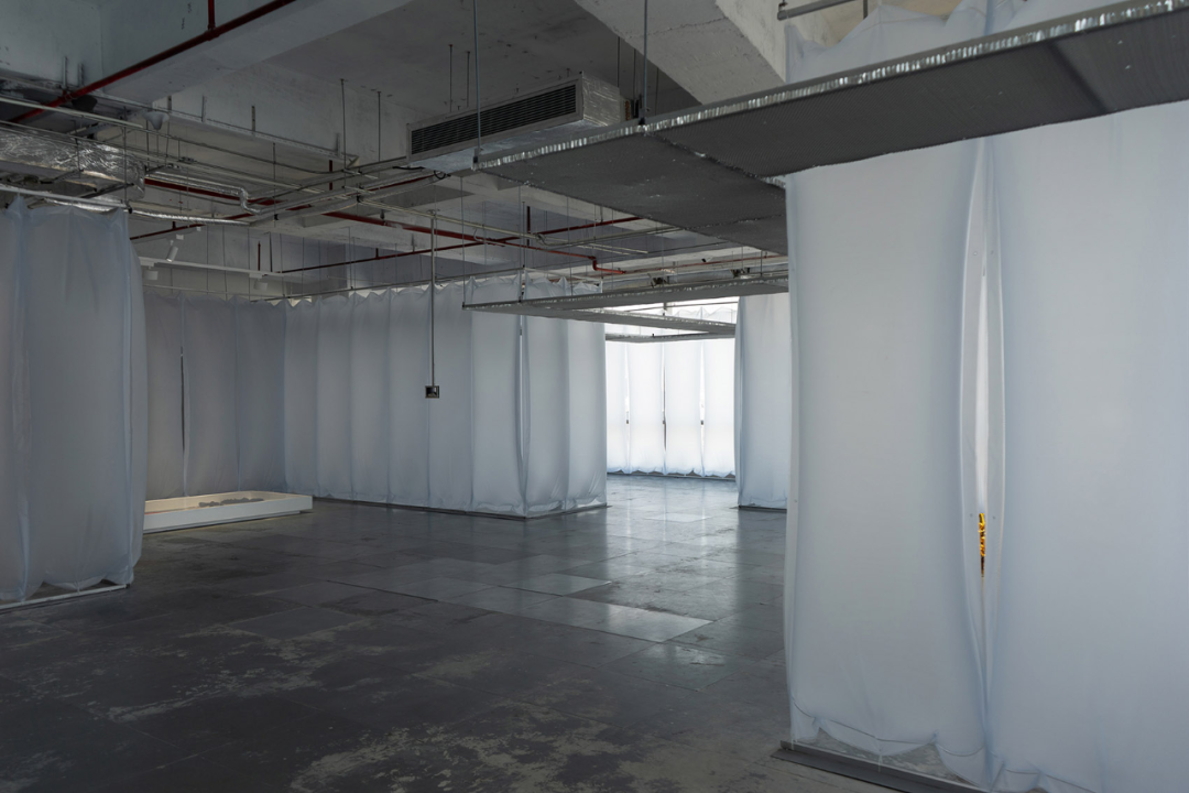 本次泰康精品收藏展位于深圳市中心高层写字楼的一处即将被重新装修的办公空间,展期为两个月。利用当前拆除前一次装修后的毛坯过渡状态,我们将本次展览置入其中。就像一个终会醒来的梦境一样,这个临时的展览事件被折叠在两个办公室交接的时空内。我们试图从展览设计的角度,在有限的时间和空间内,与泰康空间一起探讨个体情感与城市的关系。