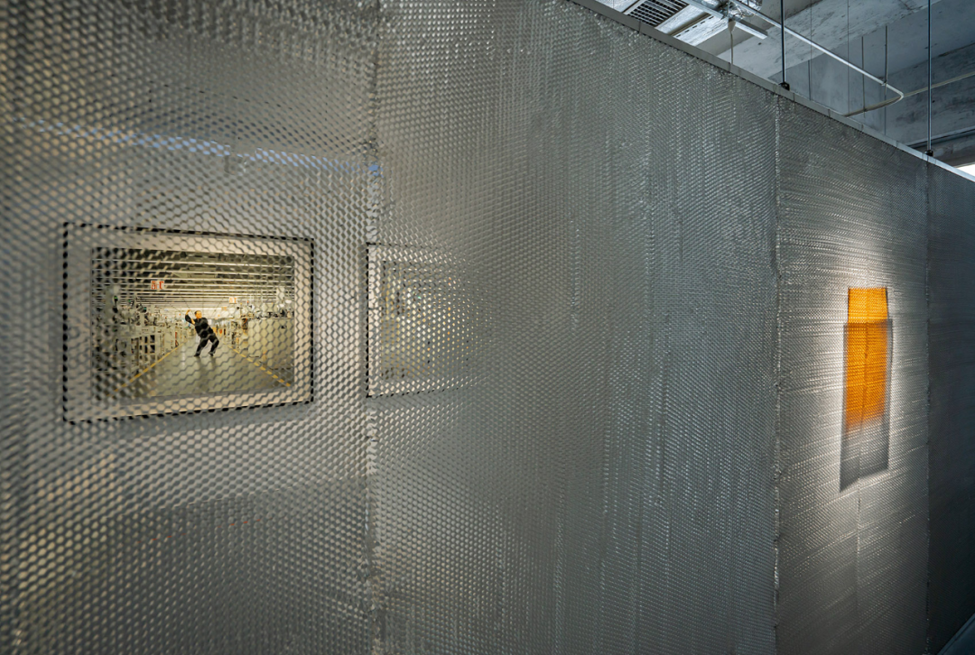 一道铝蜂窝芯顶廊由入口延伸至整个主展厅空间,在尾厅转化为立面,引导观众的观展流线的同时,引领着空间叙事节奏。铝蜂窝芯正立面可透视至一侧的城市景观和另一侧的艺术作品。随着观众的走动,观看角度不断变化,材料呈现金属质感并反射临近的景像与光线。一日间不断变化的自然光线和其他观众的漫游身影映射在铝蜂窝芯墙面上,形成动态的光影质感。观众在观展的过程中,会遇到只属于此刻此地的观感记忆。这种设计不仅增添了展览的视觉层次和趣味性,也为观众带来了与作品互动的体验。
