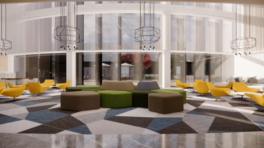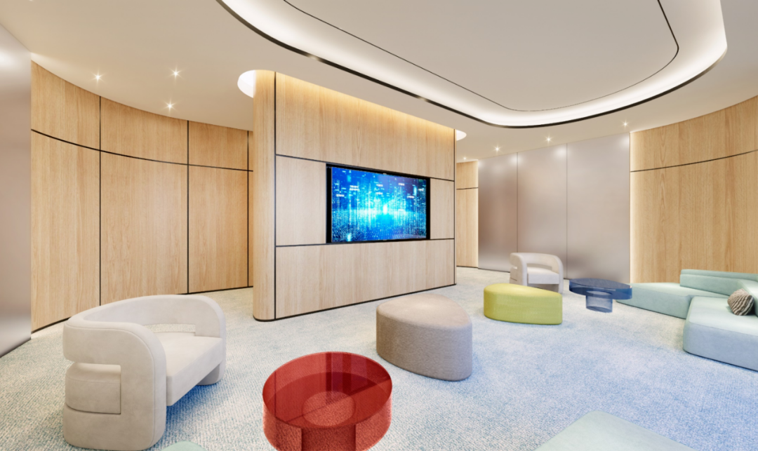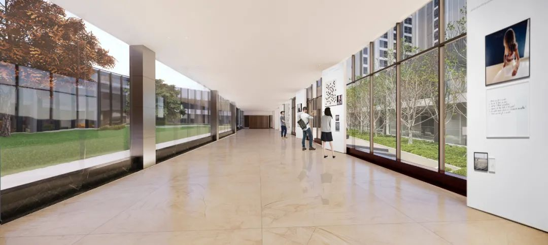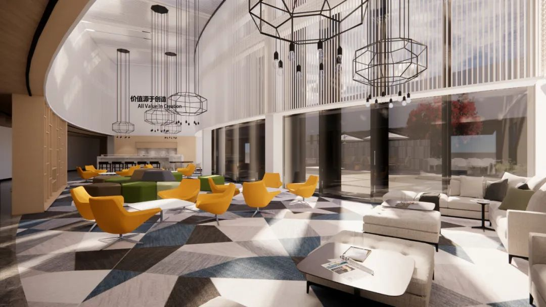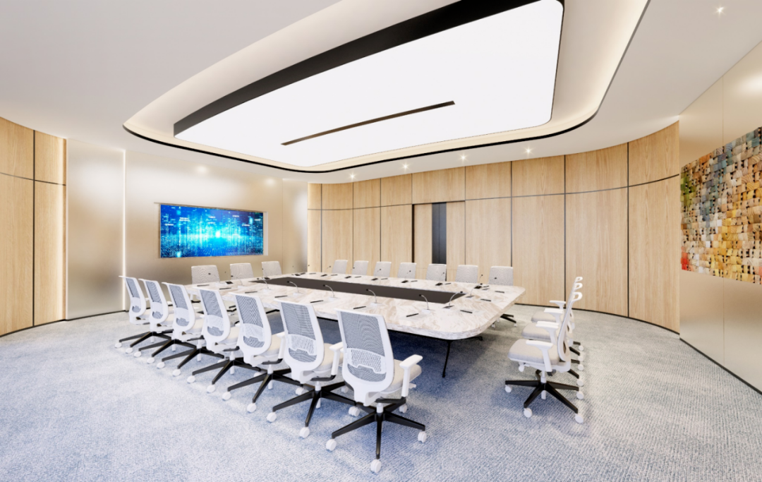 The fashionable and bright white is used as the muscle background color of the space at the front hall entrance. The enterprise logo under the light film mapping gives the viewer a sense of sacredness and awe as soon as they come in. The device on one side enhances the artistic atmosphere.