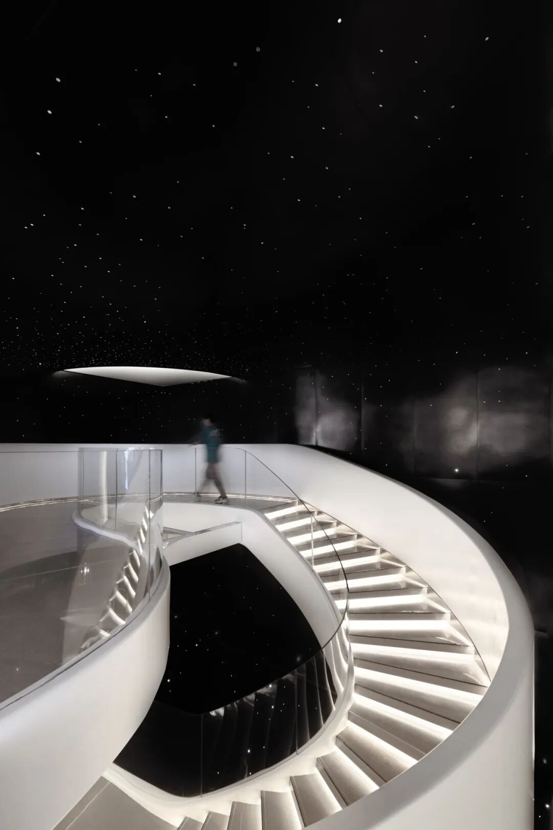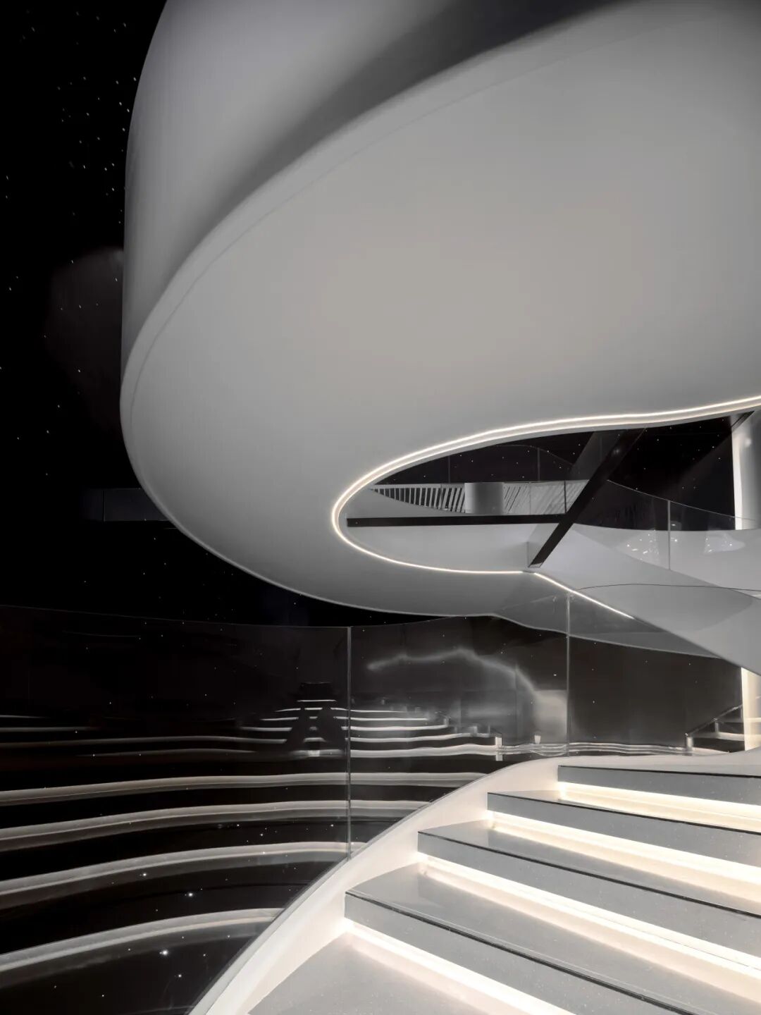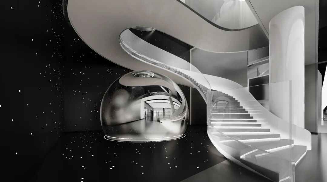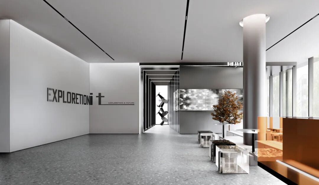 在空中接待大堂,我们创造了“时空站台,探索之旅”的主题体验,将空间打造成充满未来感的品牌展示区。这里,设计与科技的结合不仅传达了强烈的品牌感和主题感,也为访客开启了一场关于探索与创享的旅程。通过创新的设计手法,空间仿佛成为时空穿梭的平台,鼓励访客以新的视角探索百利的产品和理念,预见办公空间的未来可能性。