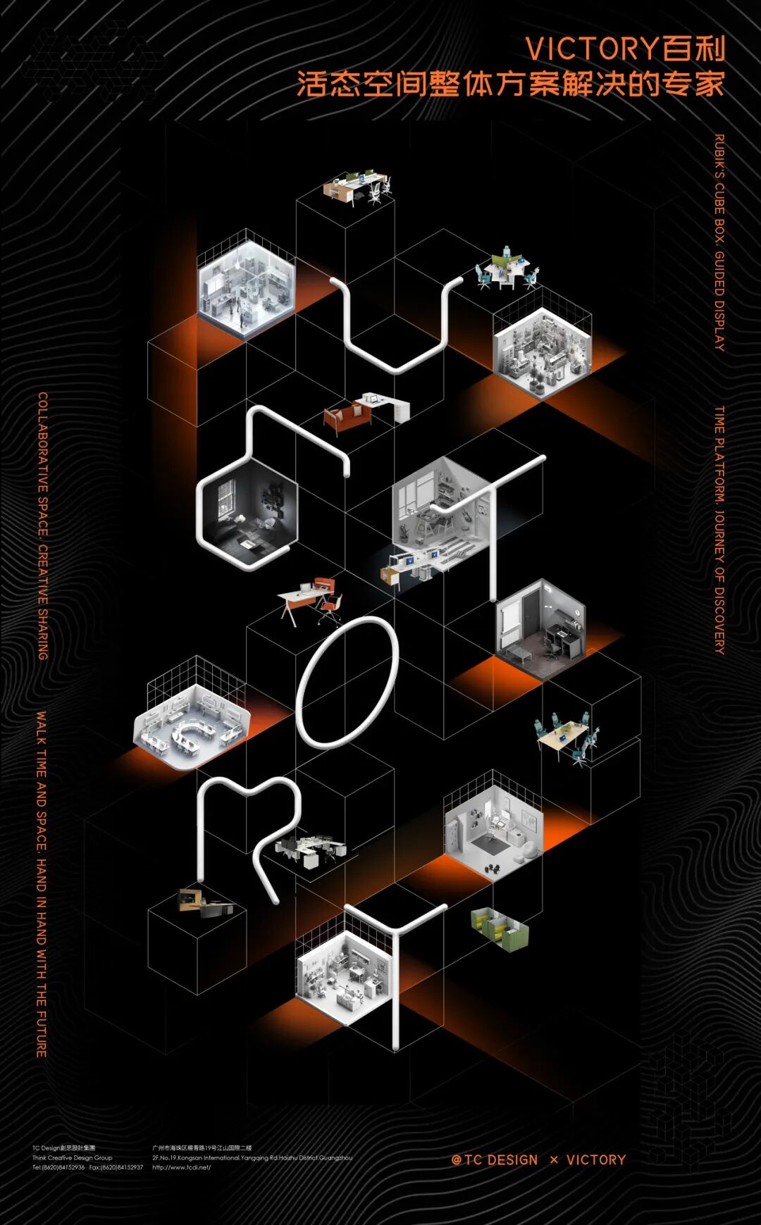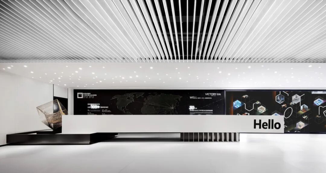 我们将接待处设计成富有互动性的魔方艺术装置。每个面展现公司的不同方面,引导访客深入了解百利。这不仅是一个视觉焦点,也象征着企业的多元化和适应力,同时为访客提供了一种新颖的互动体验。